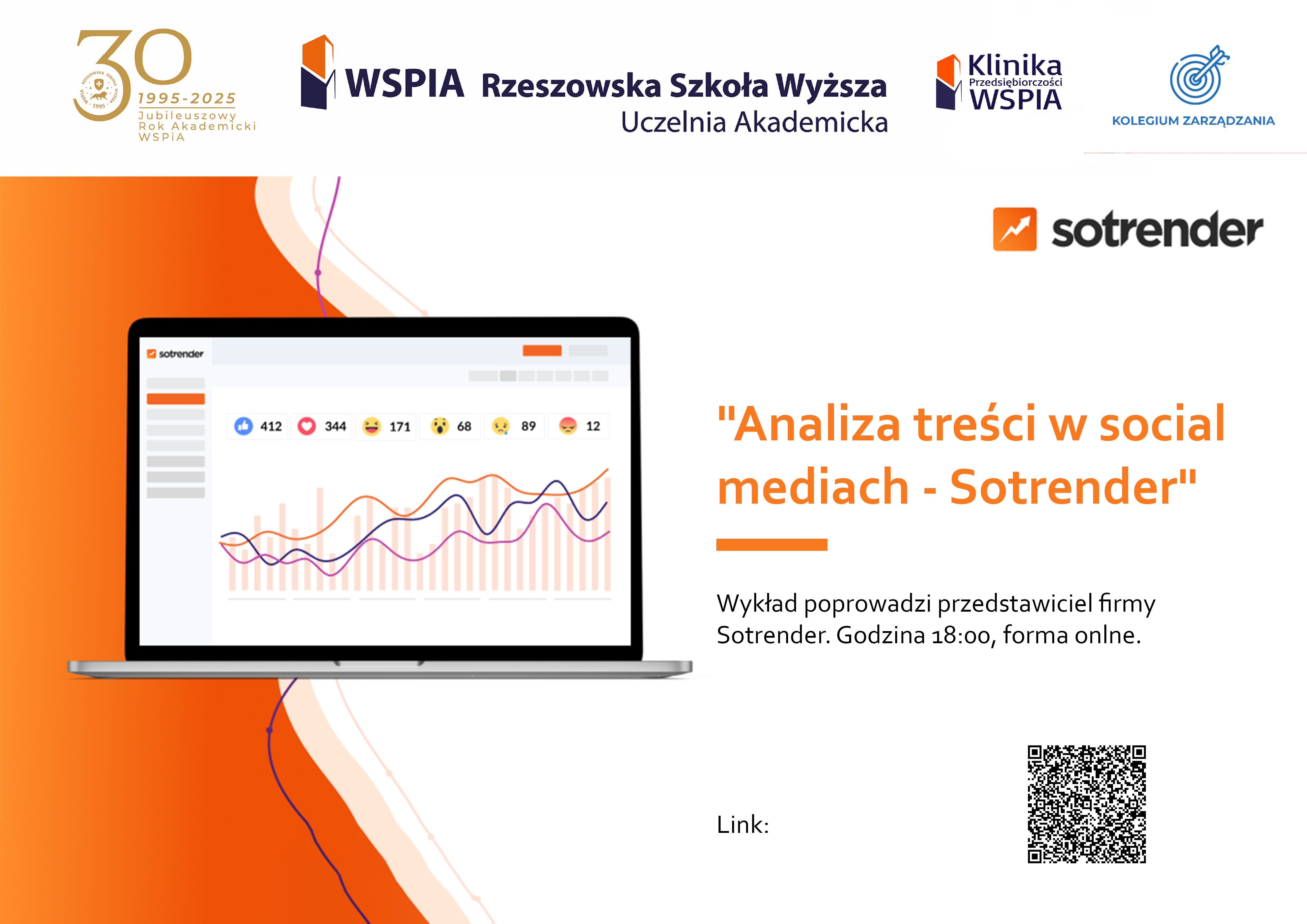 - Wykład otwarty pt.: "Analiza treści w social mediach - Sotrender", organizowany przez Klinikę Przedsiębiorczości WSPiA. Wykład poprowadzi przedstawiciel firmy Sotrender. Godzina 18:00, forma onlne. Link: Wykład otwarty pt.: "Analiza treści w social mediach - Sotrender" | Dołączanie do spotkania | Microsoft Teams