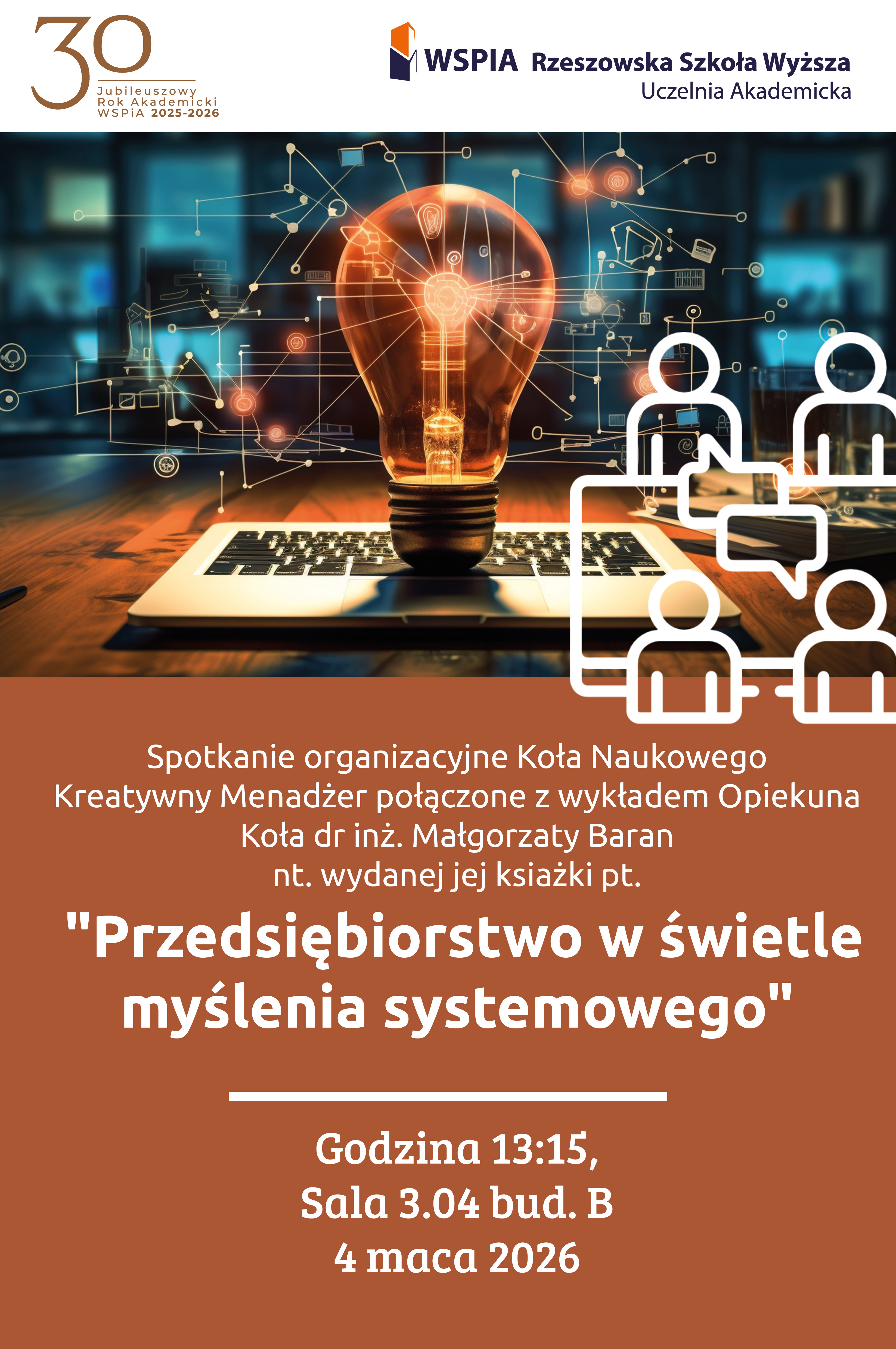 Spotkanie organizacyjne Koła Naukowego Kreatywny Menadżer połączone z wykładem Opiekuna Koła dr inż. Małgorzaty Baran nt. wydanej jej ksiażki pt. "Przedsiębiorstwo w świetle myślenia systemowego". Sala 3.04, godzina: 13:15.