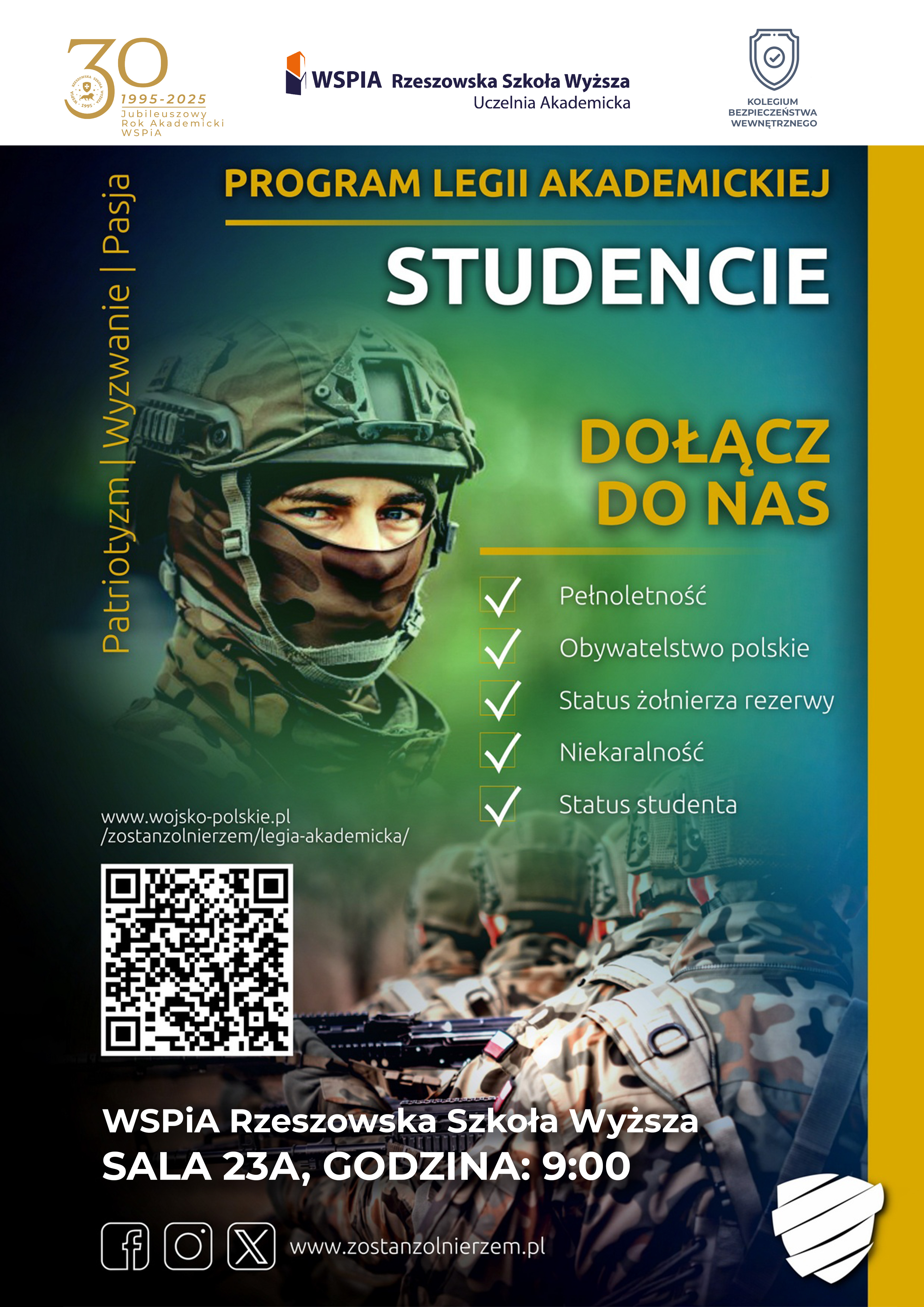 - Spotkanie z przedstawicielami Związku Strzeleckiego STRZELEC im. Józefa Piłsudskiego organizowane przez Kolegium Bezpeczeństwa Wewnętrznego i Kryminologii. Temtyka spotkania: Zostań Strzelcem. Sala 23A, godzina 9:45.