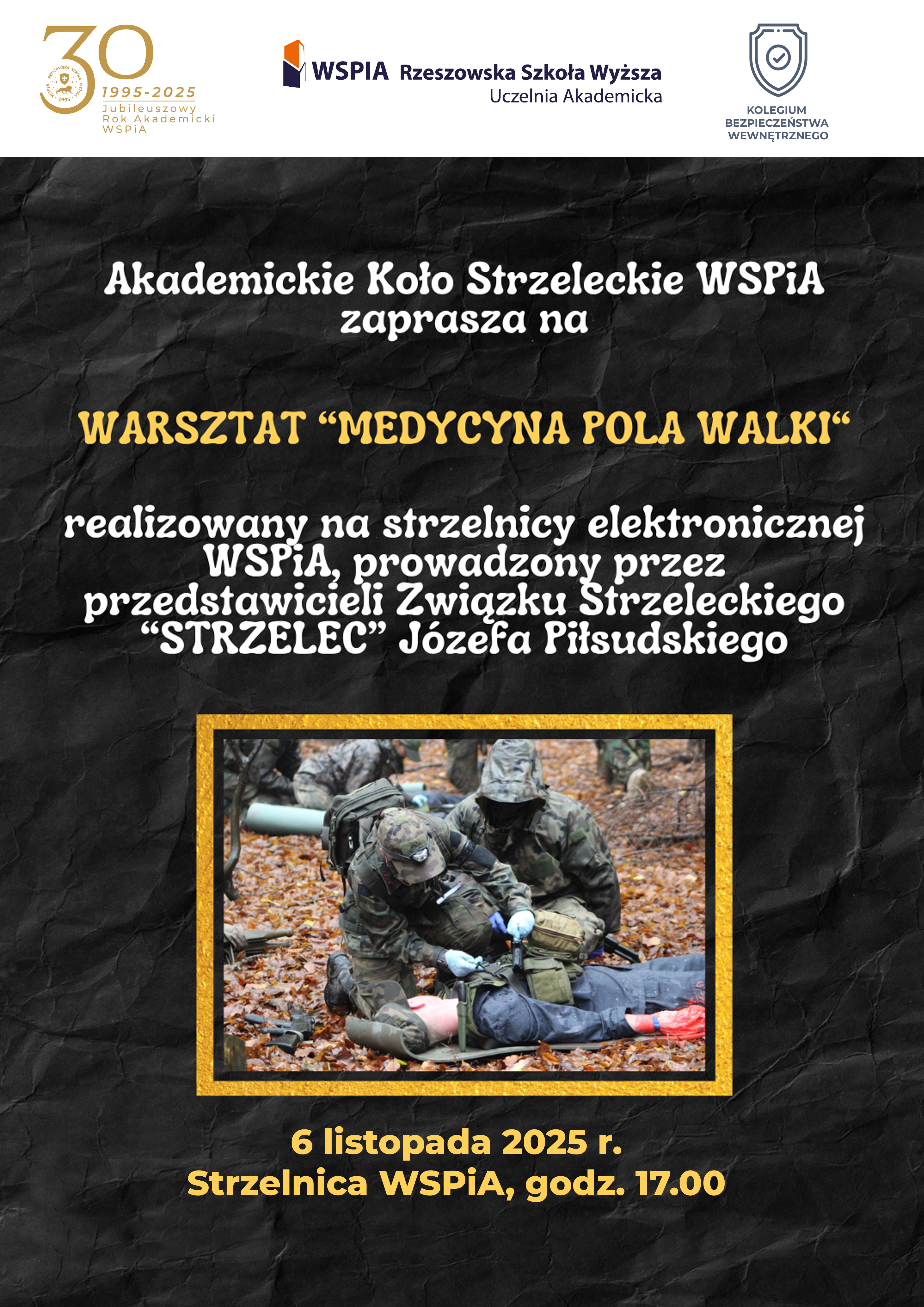 - W dniu 6 listopada zapraszamy na warsztat “Medycyna pola walki“ - prowadzony przez przedstawicieli Związku Strzeleckiego “STRZELEC” Józefa Piłsudskiego, organizowany przez Akademickie Koło Strzeleckie. Strzelnica WSPiA, godzina: 17:00.