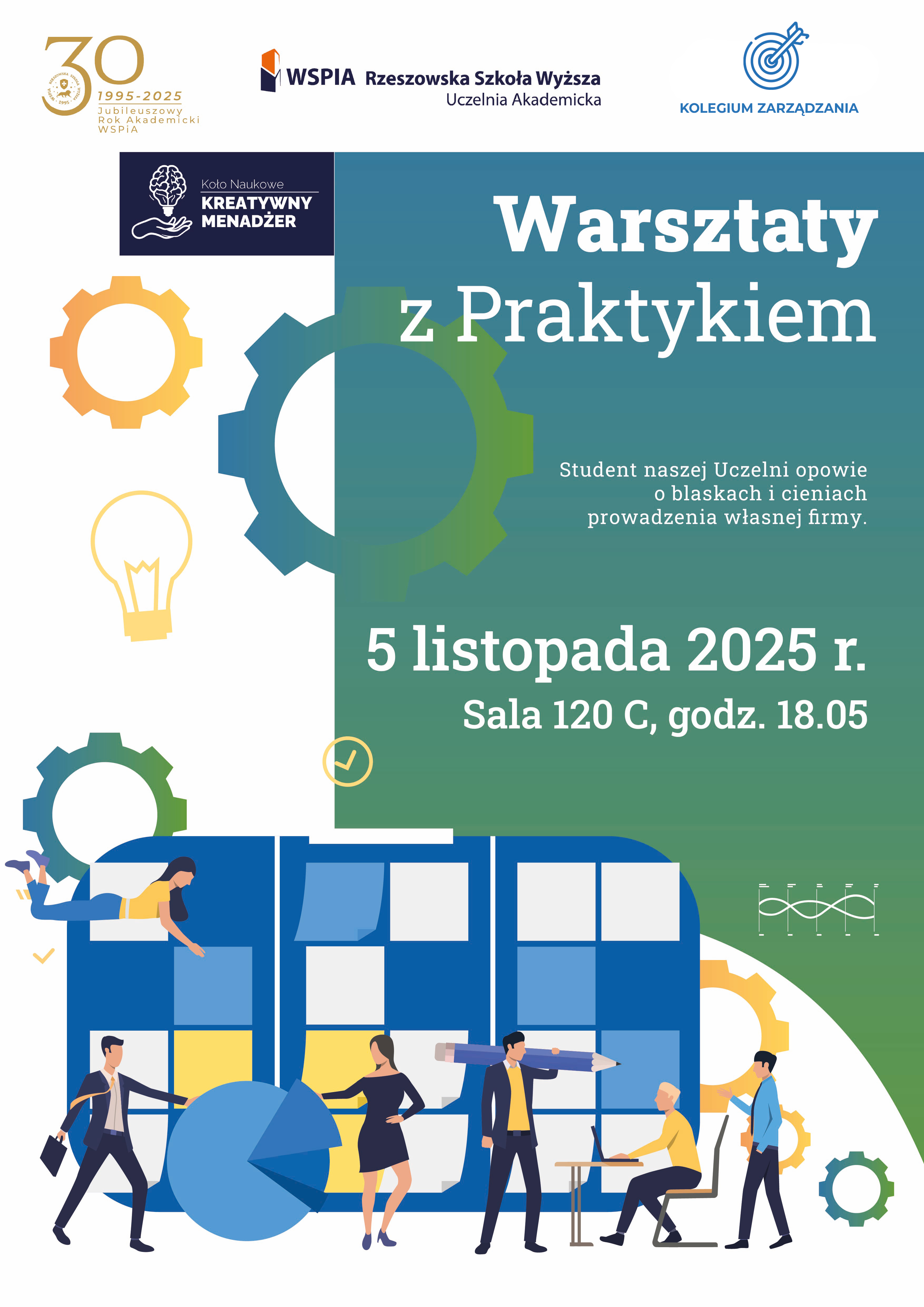 - W dniu 5 listopada zapraszamy na spotkanie z cyklu "Warsztaty z praktykiem" - student naszej Uczelni opowie o blaskach i cieniach prowadzenia własnej firmy, organizowane przez Koło Naukowe Kreatywny Menadżer. Sala 120C, godzina: 18:05.