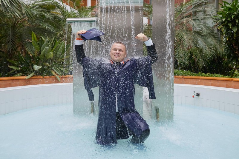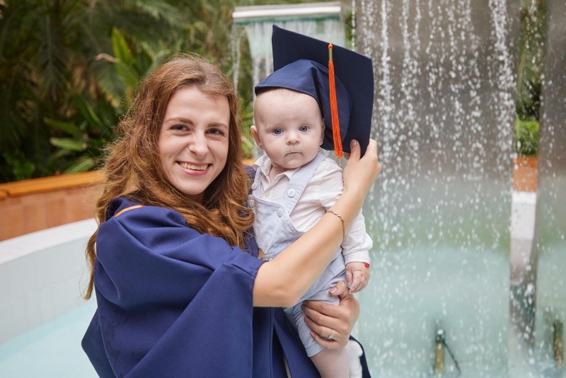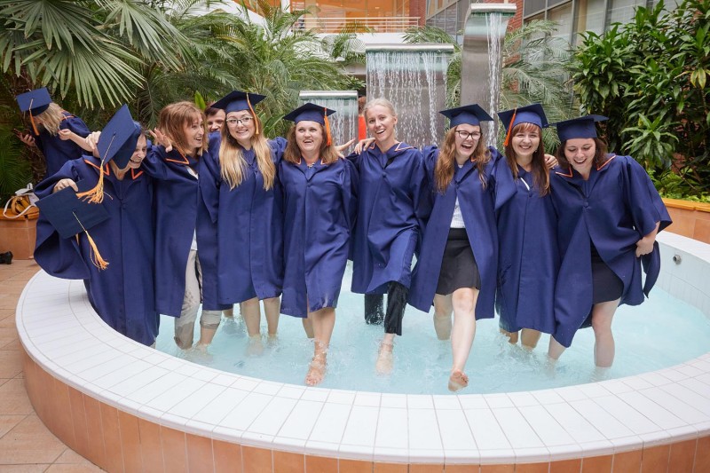 Uroczystość zakończyło pamiątkowe zdjęcie absolwentów i władz uczelni oraz sesja zdjęciowa w Patio i fontannie WSPiA.