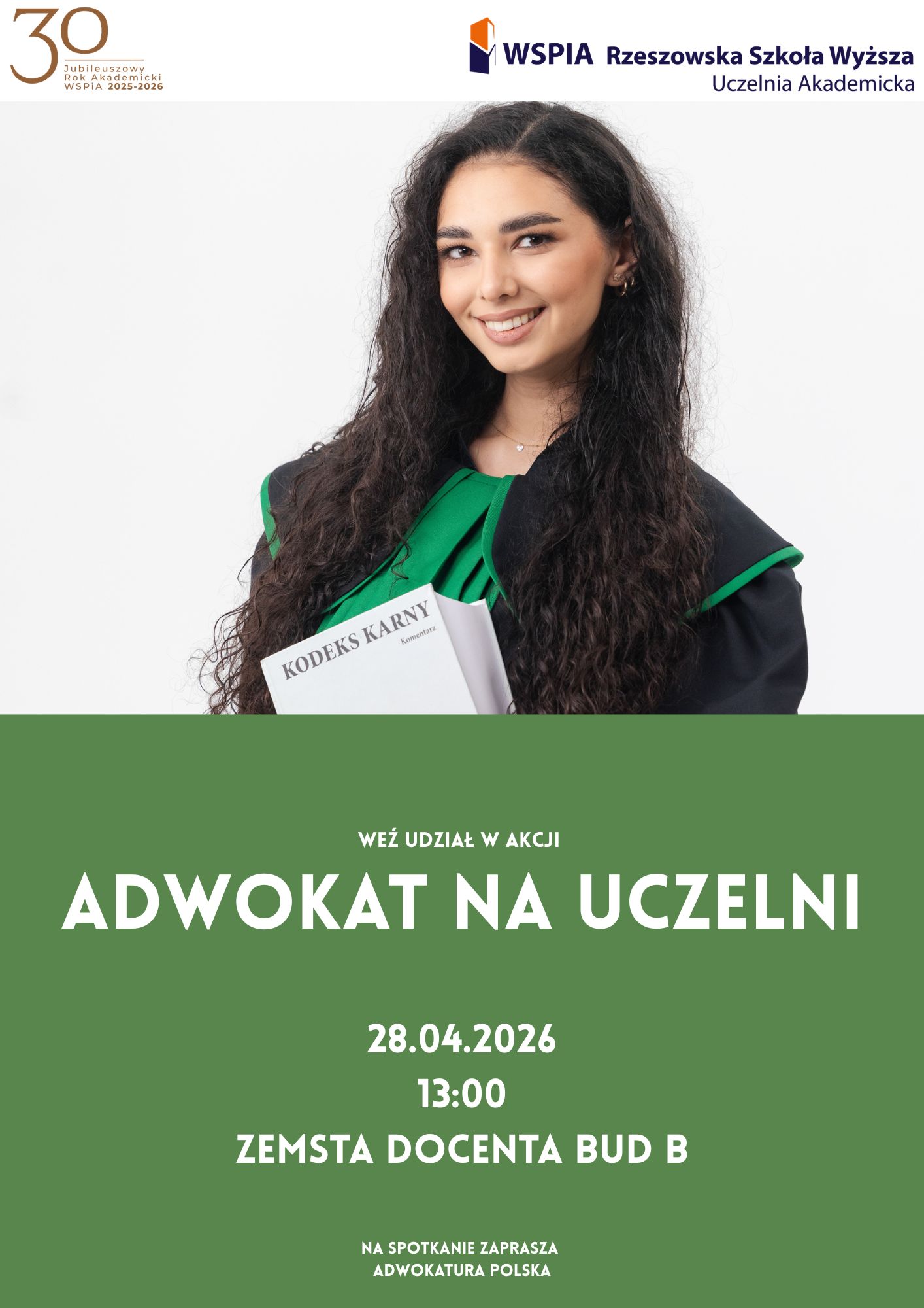 Rusza IV edycja akcji „Adwokat na Uczelni”, organizowanej pod patronatem Naczelnej Rady Adwokackiej w Warszawie. 28 kwietnia 2026 roku WSPiA Rzeszowska Szkoła Wyższa zamieni się w epicentrum życia prawniczego, skupiając adwokatów i aplikantów adwokackich, którzy odpowiedzą na wszystkie te bardziej oraz te mniej oczywiste pytania związane z praktyką ich zawodu.