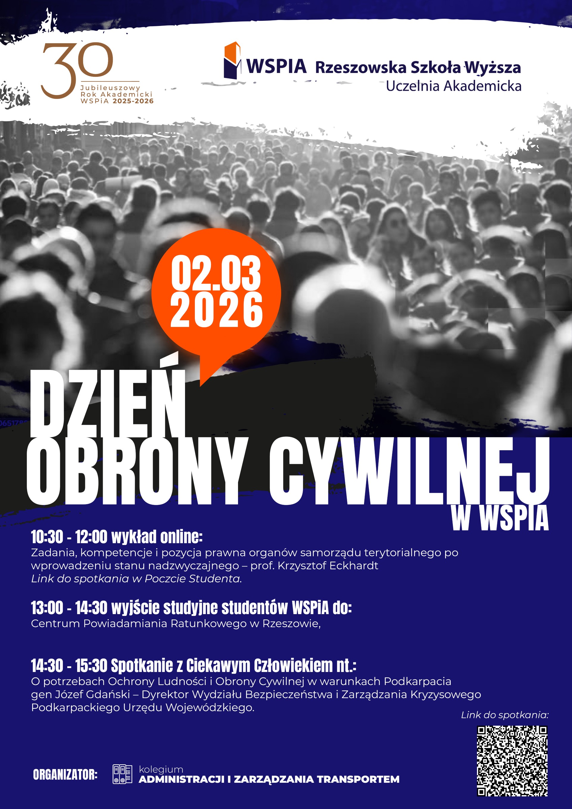 WSPiA zaprasza studentów do udziału w Dniu Obrony Cywilnej, wydarzeniu, które łączy refleksję nad prawnymi aspektami funkcjonowania państwa w sytuacjach nadzwyczajnych z praktycznym spojrzeniem na system bezpieczeństwa w regionie. Inicjatywa stanowi jeden z elementów jubileuszowego kalendarza obchodów 30-lecia WSPiA Rzeszowskiej Szkoły Wyższej.