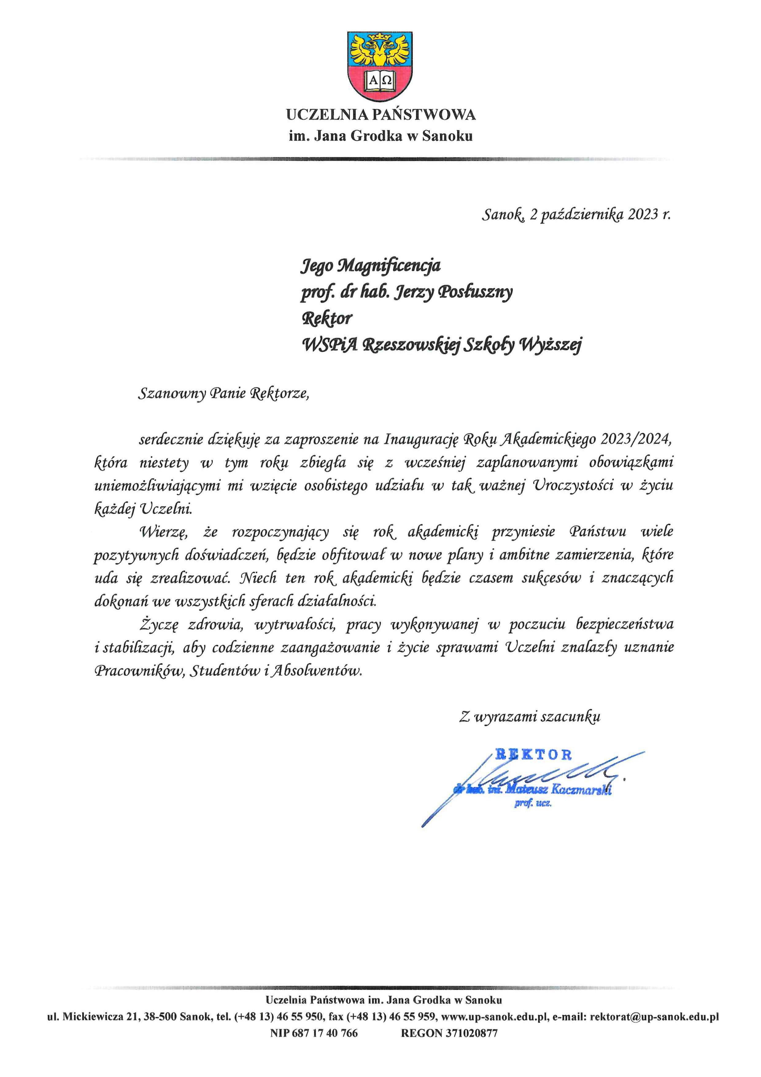 - dr hab. inż. Mateusz Kaczmarski prof. ucz. – Rektor Uczelni Państwowej w Sanoku