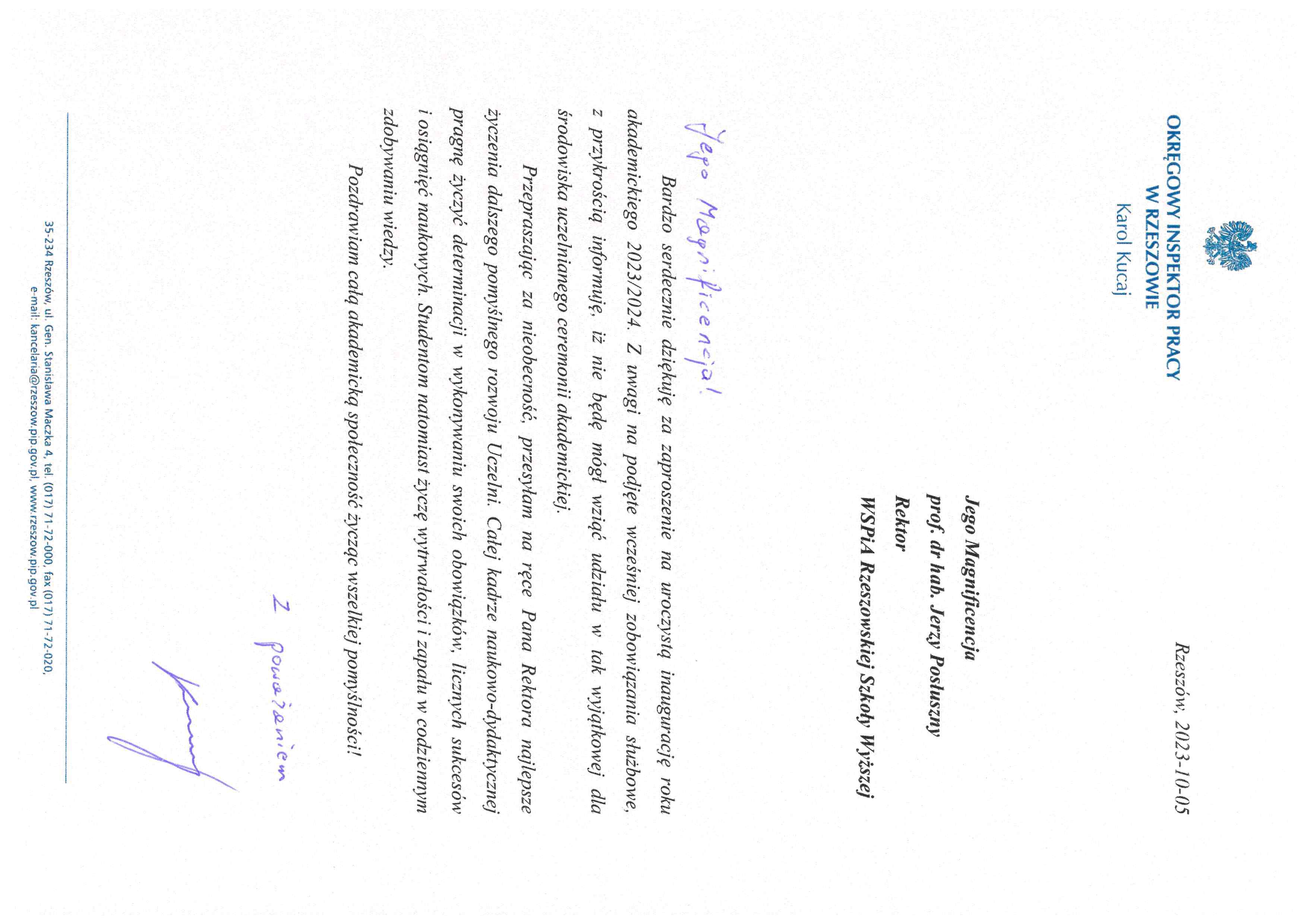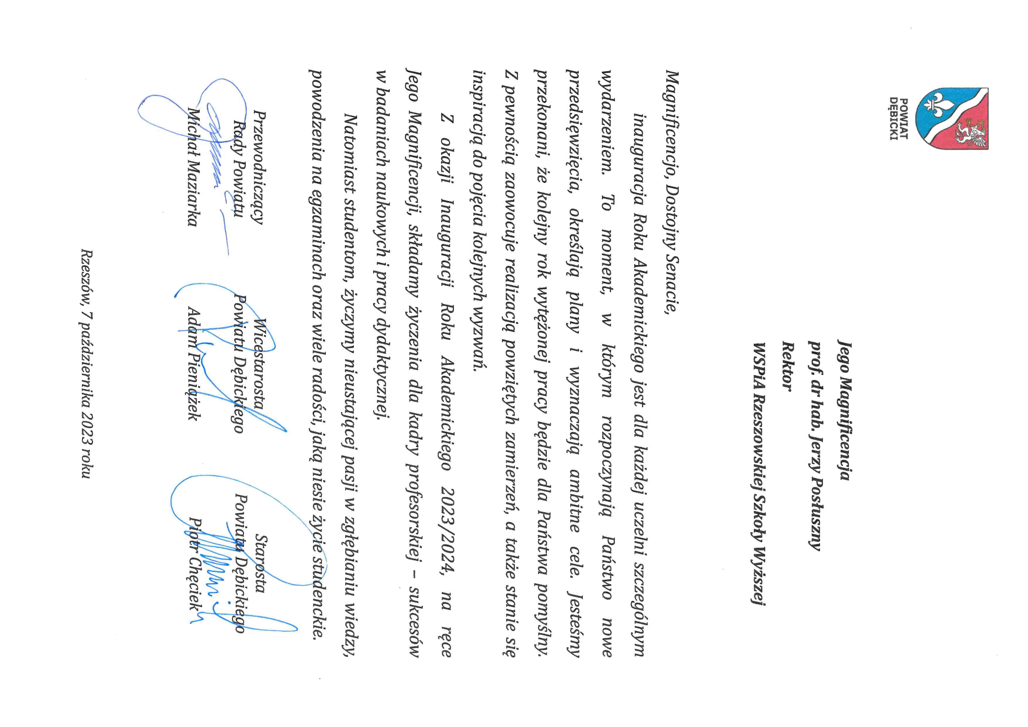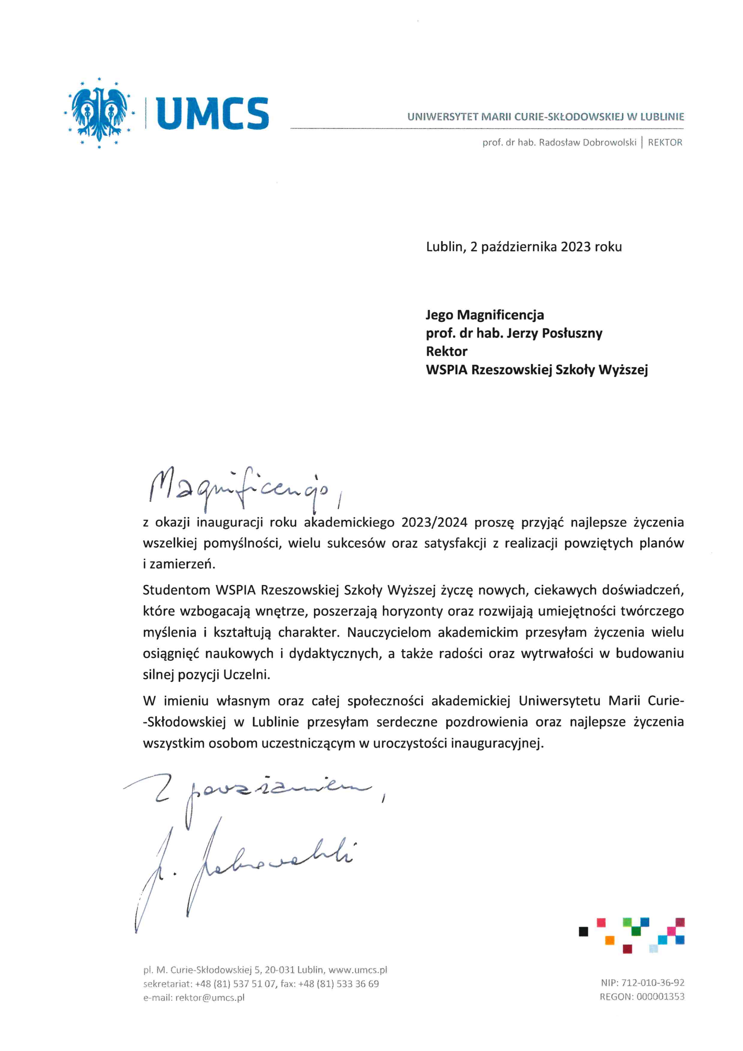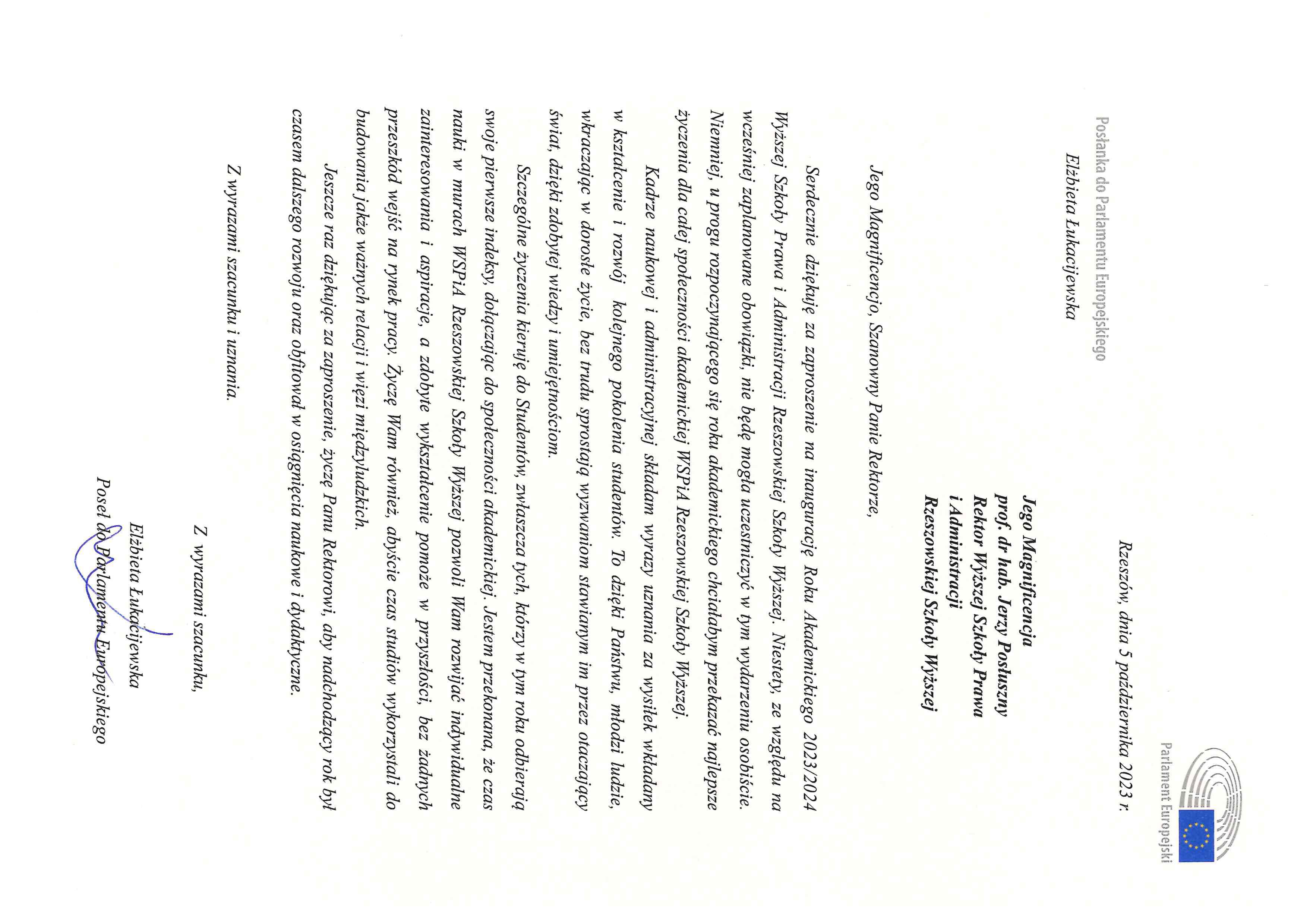 Listy gratulacyjne z okazji Inauguracji roku akademickiego w WSPiA