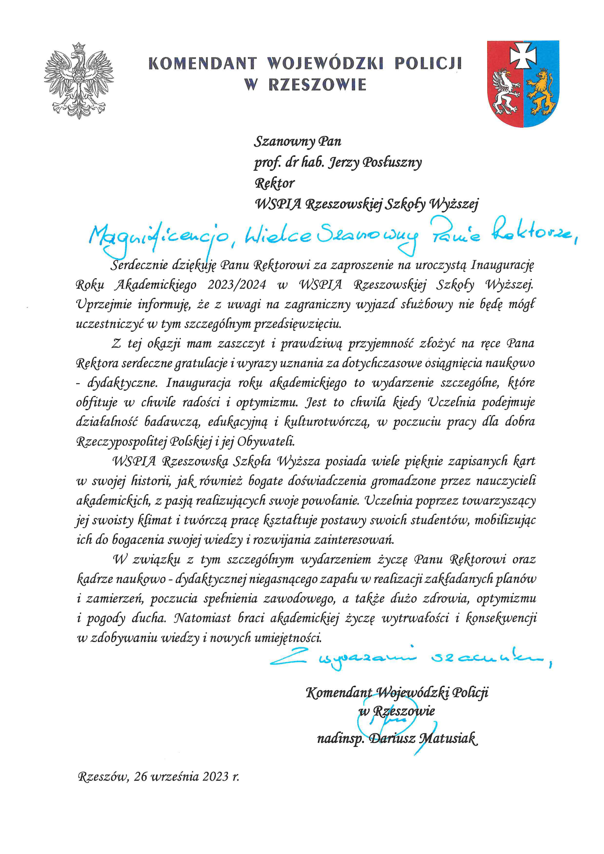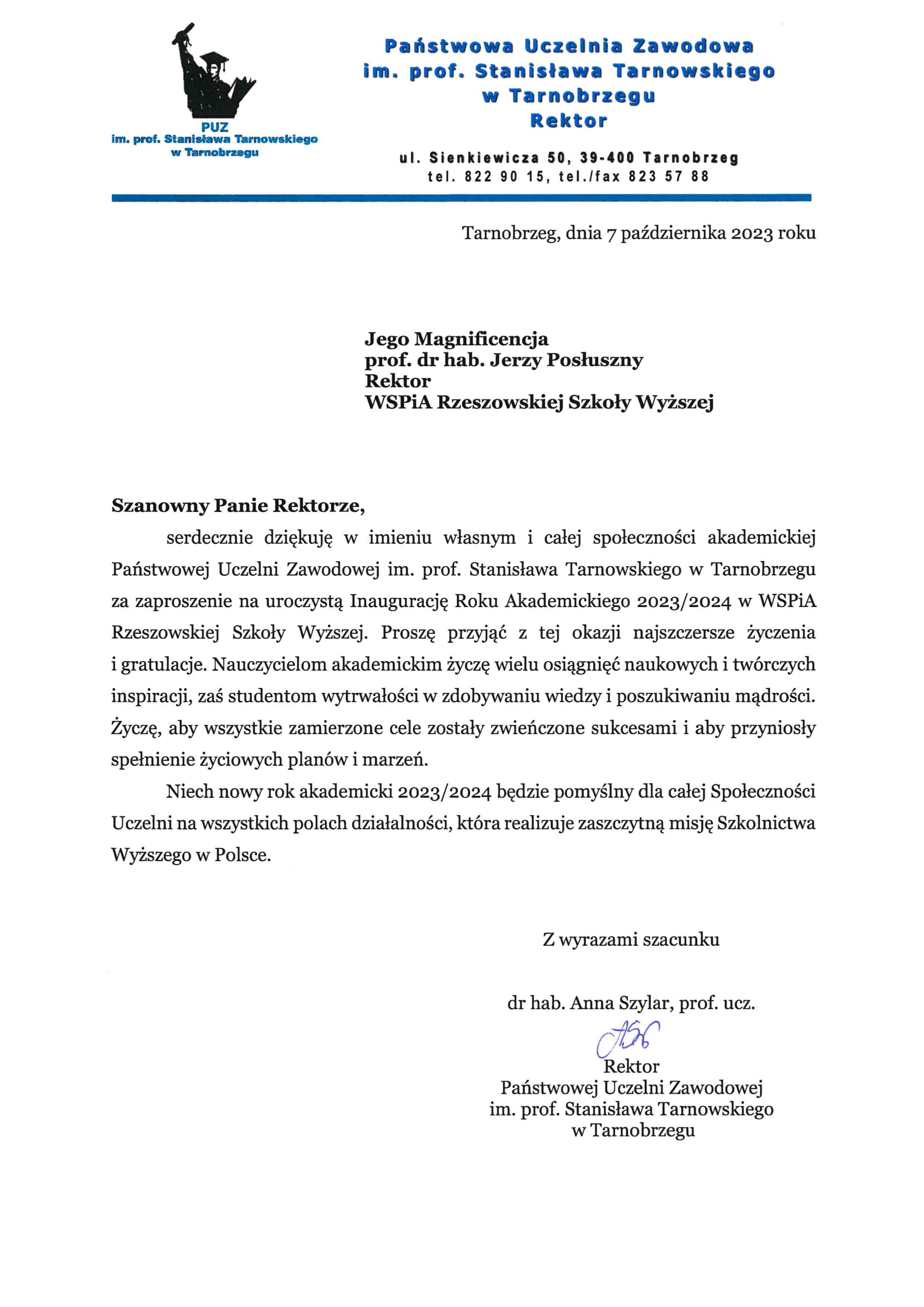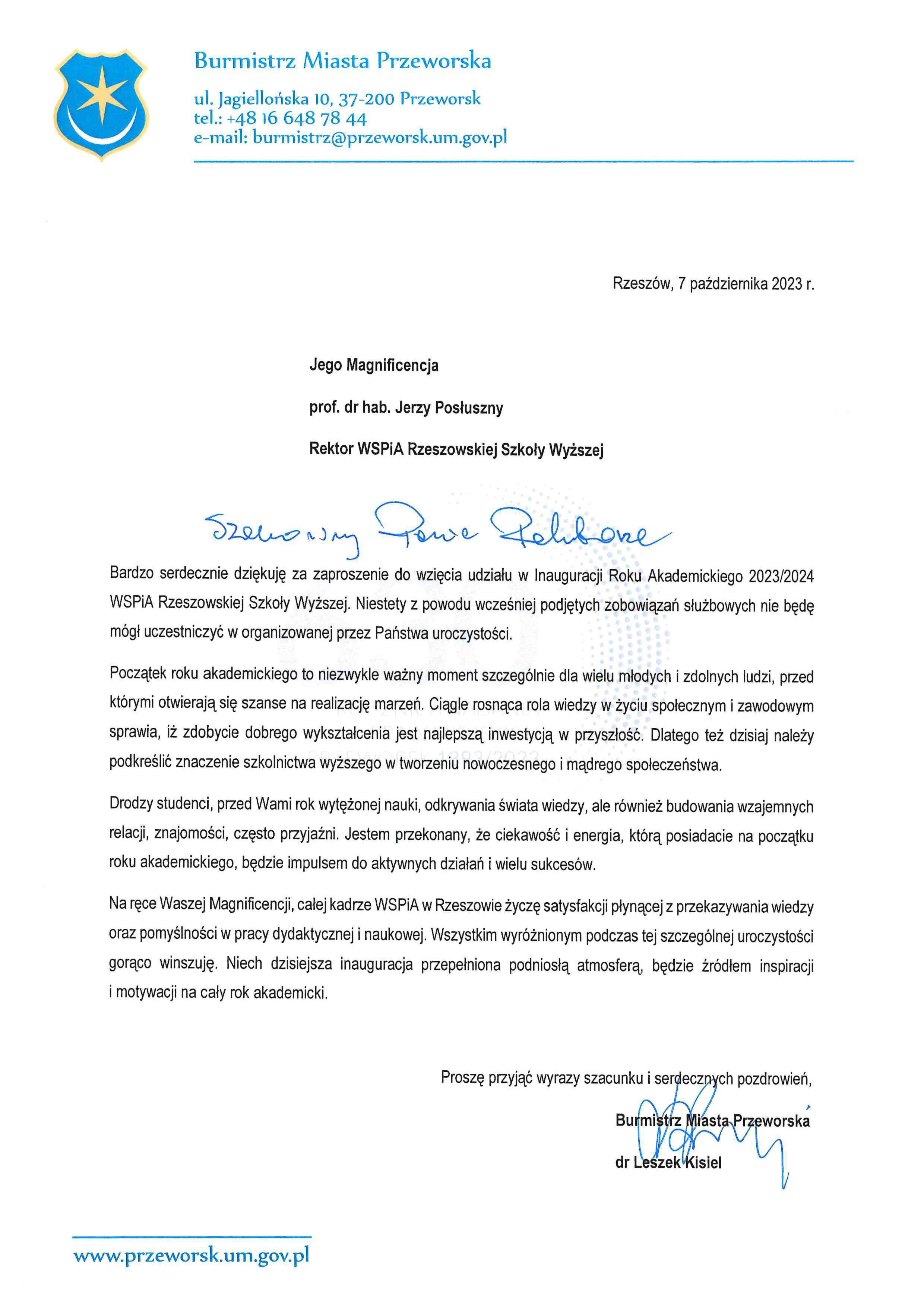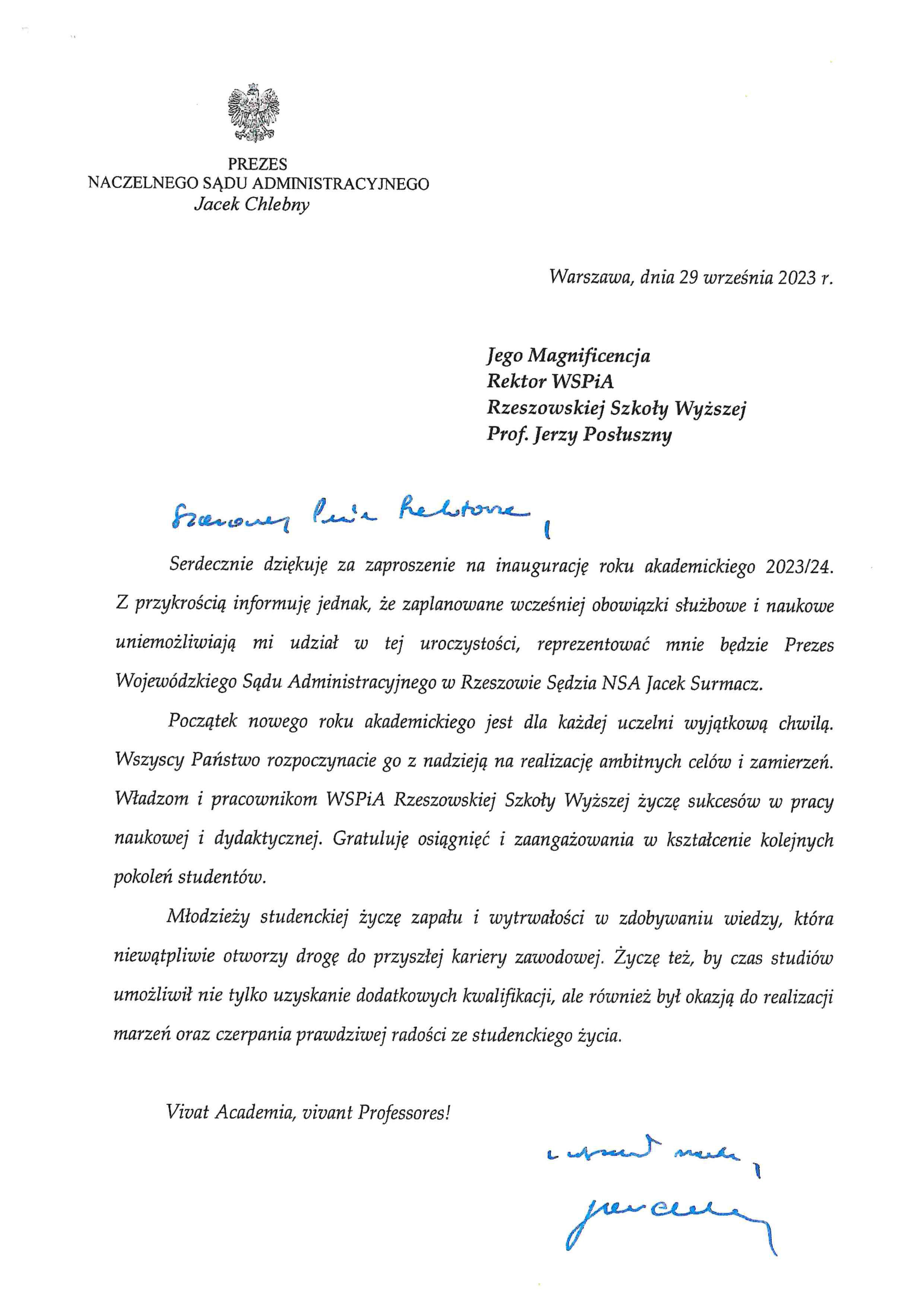 W sobotę 7 października 2023 r. WSPiA Rzeszowska Szkoła Wyższa zainaugurowała 29. Rok Akademicki. W uroczystości osobiście uczestniczy wielu znamienitych gości. Na ręce Rektora WSPiA przekazanych zostało także wiele życzeń i listów gratulacyjnych z wyrazami uznania dla działalności Uczelni.
