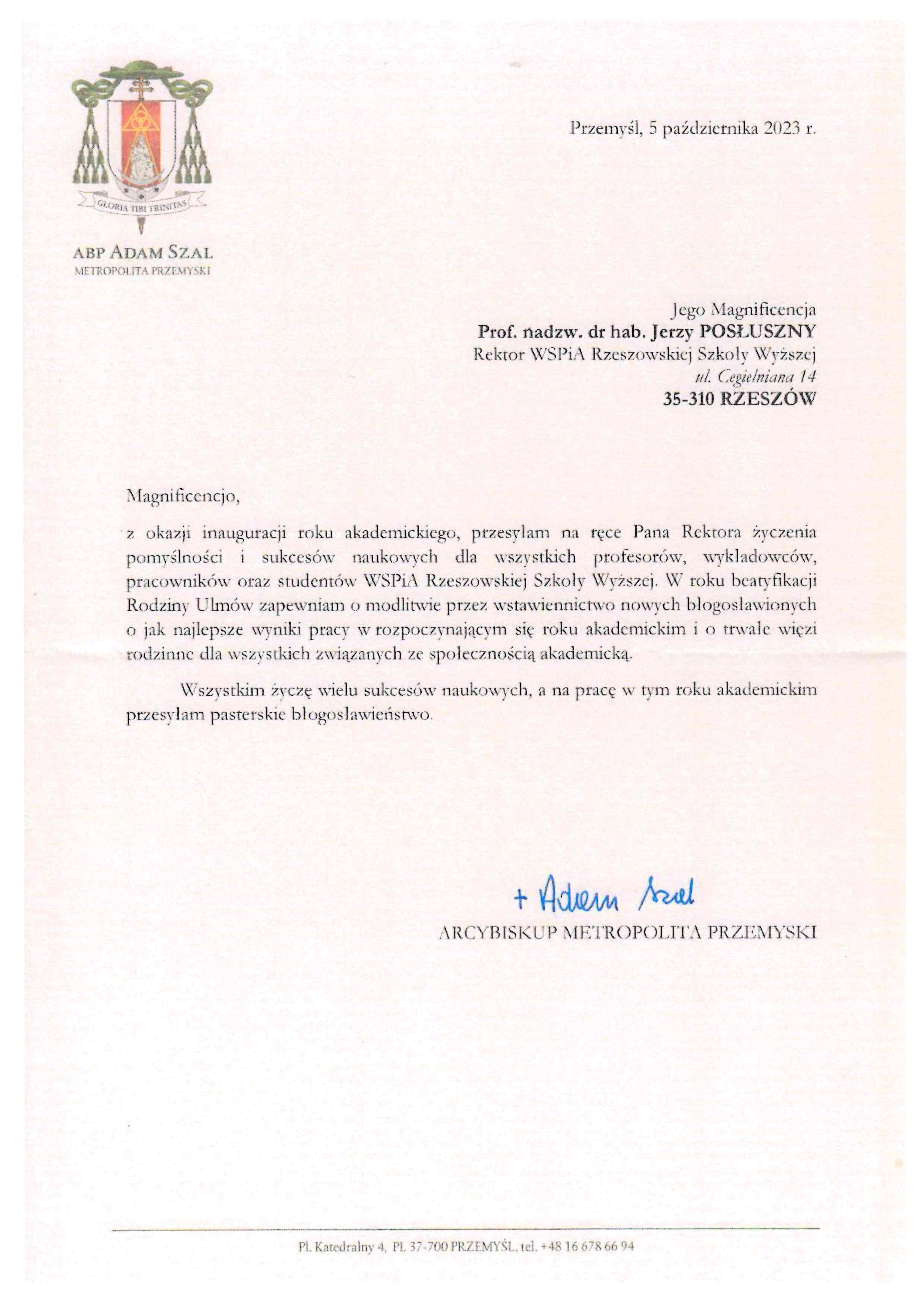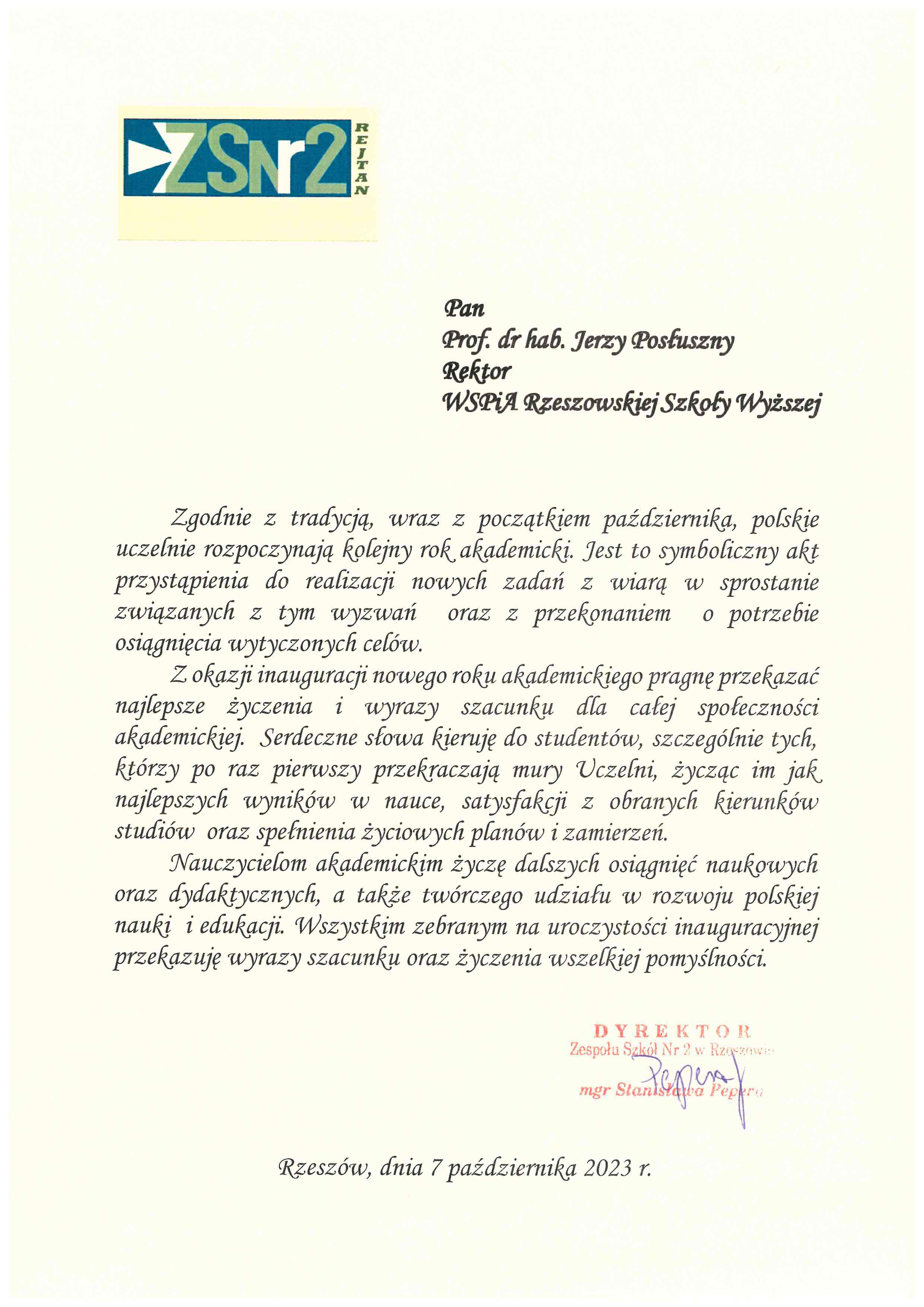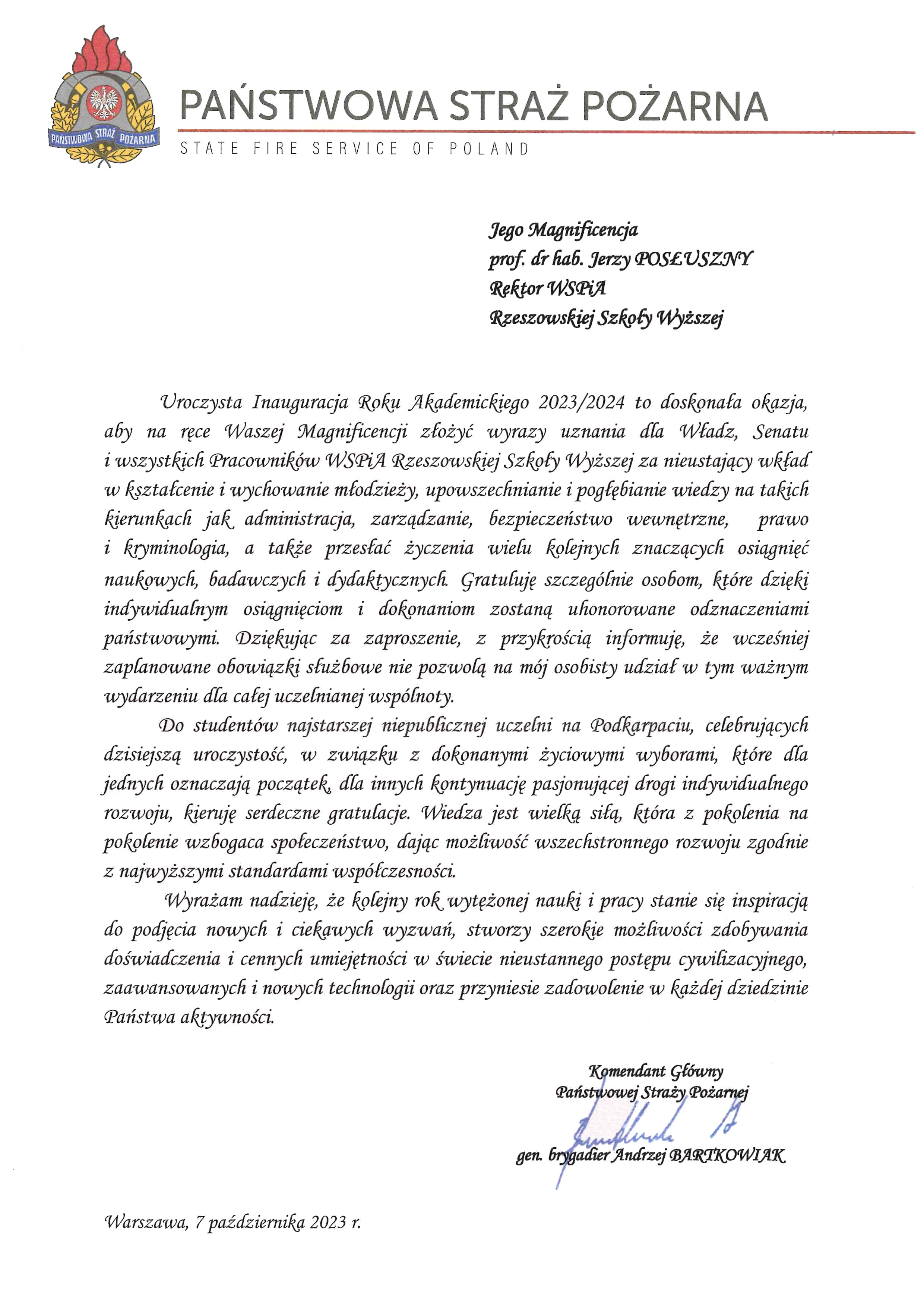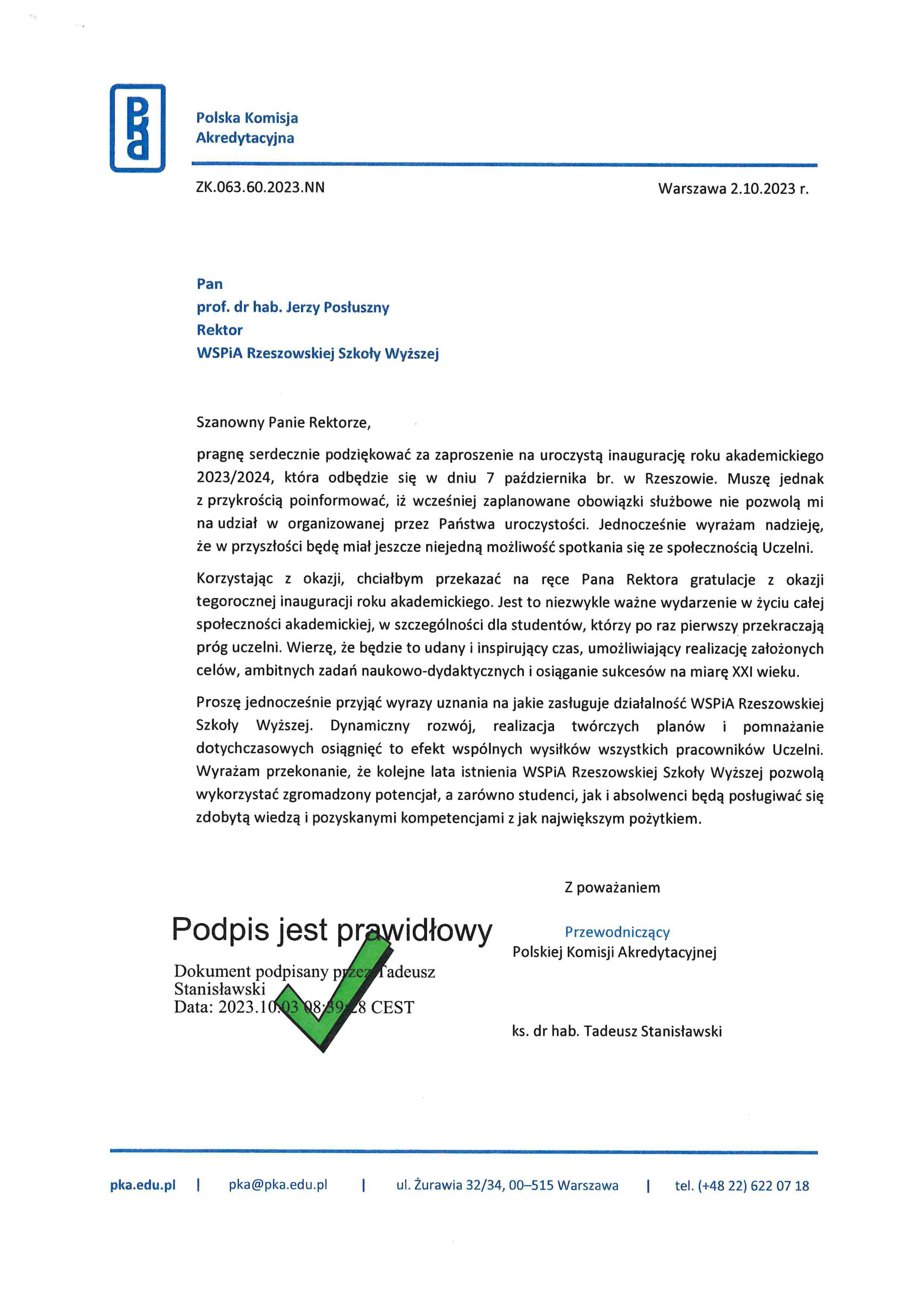 W sobotę 7 października 2023 r. WSPiA Rzeszowska Szkoła Wyższa zainaugurowała 29. Rok Akademicki. W uroczystości osobiście uczestniczy wielu znamienitych gości. Na ręce Rektora WSPiA przekazanych zostało także wiele życzeń i listów gratulacyjnych z wyrazami uznania dla działalności Uczelni.