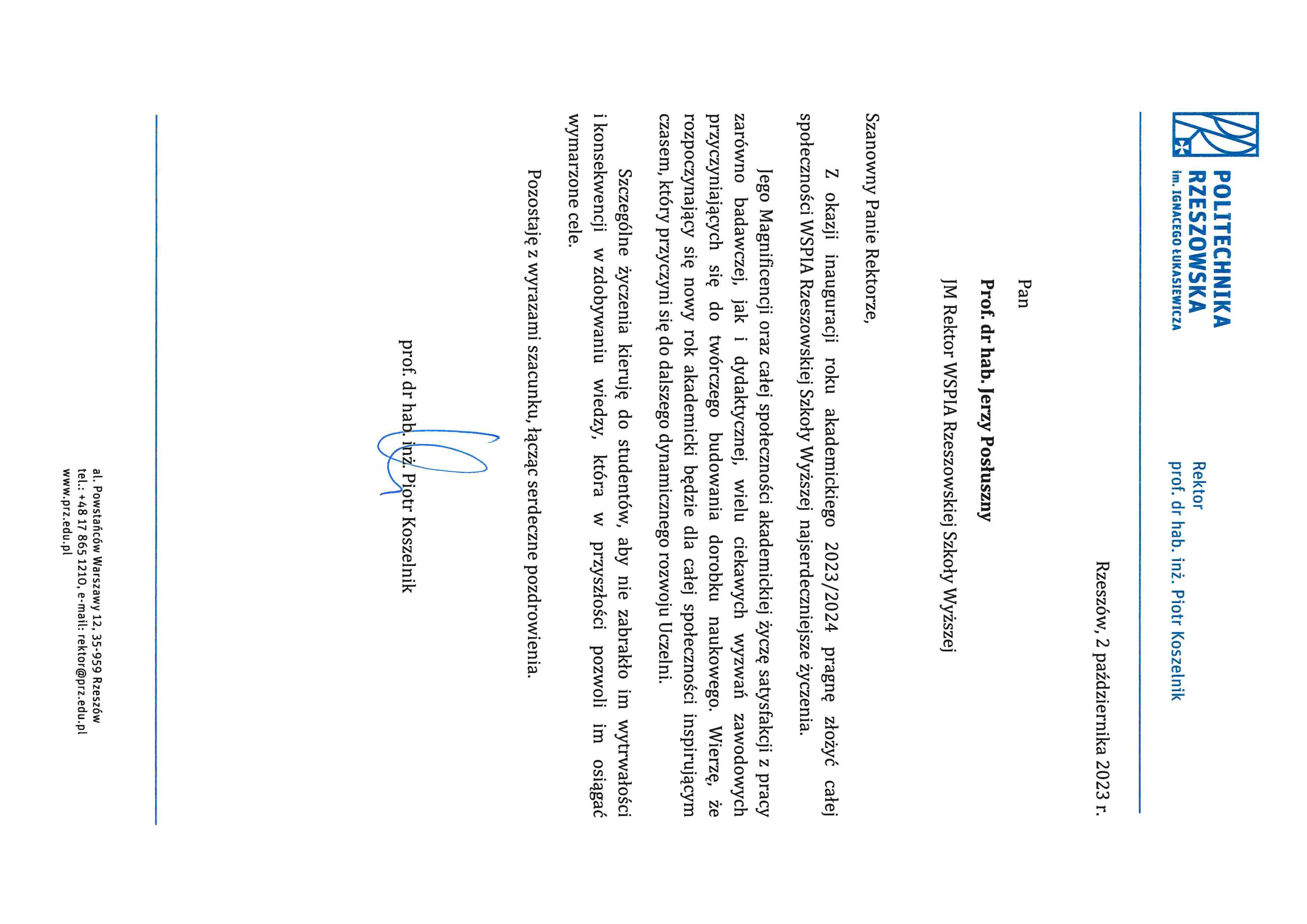- Prof. dr hab. inż. Piotr Koszelnik – Rektor Politechniki Rzeszowskiej