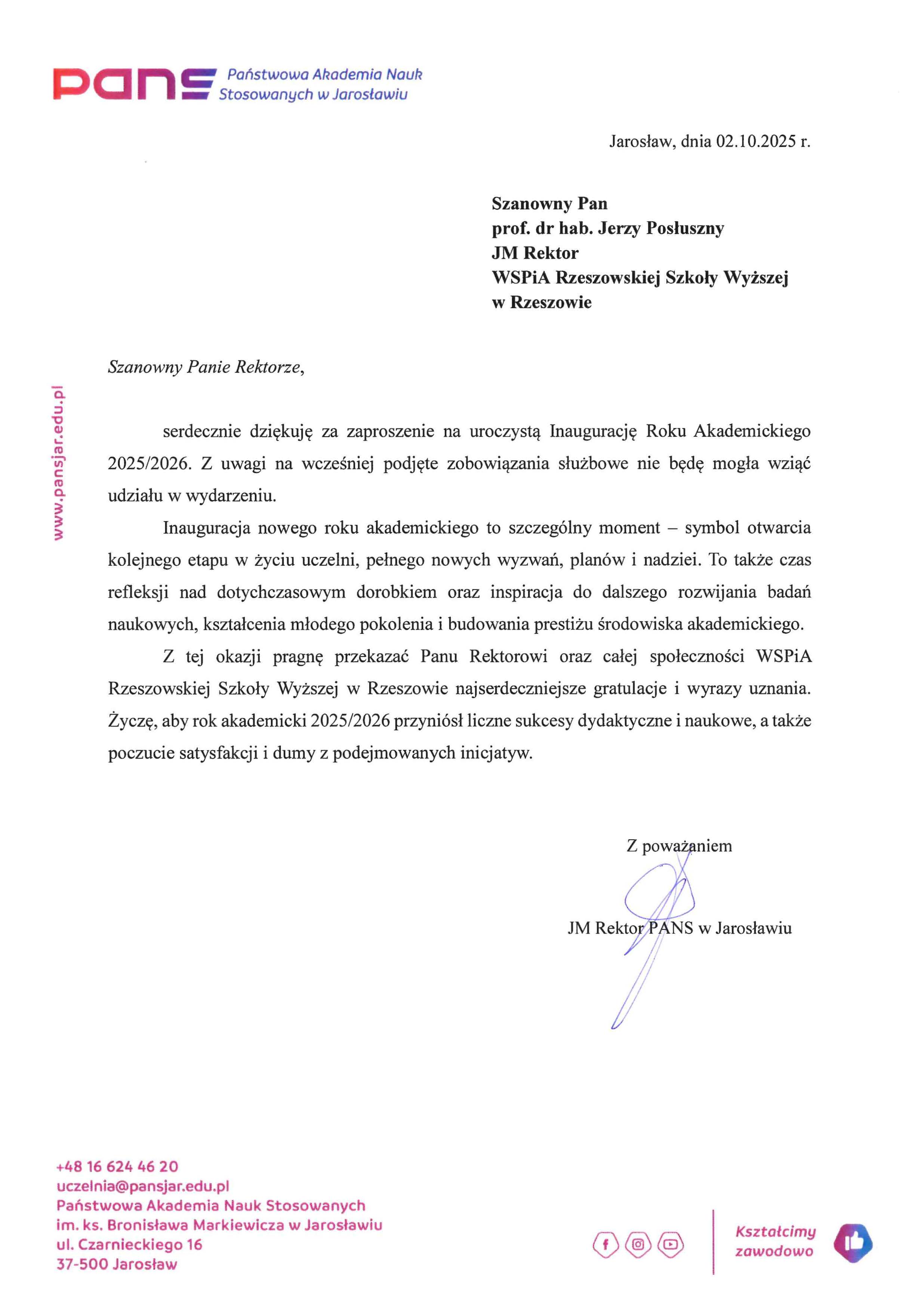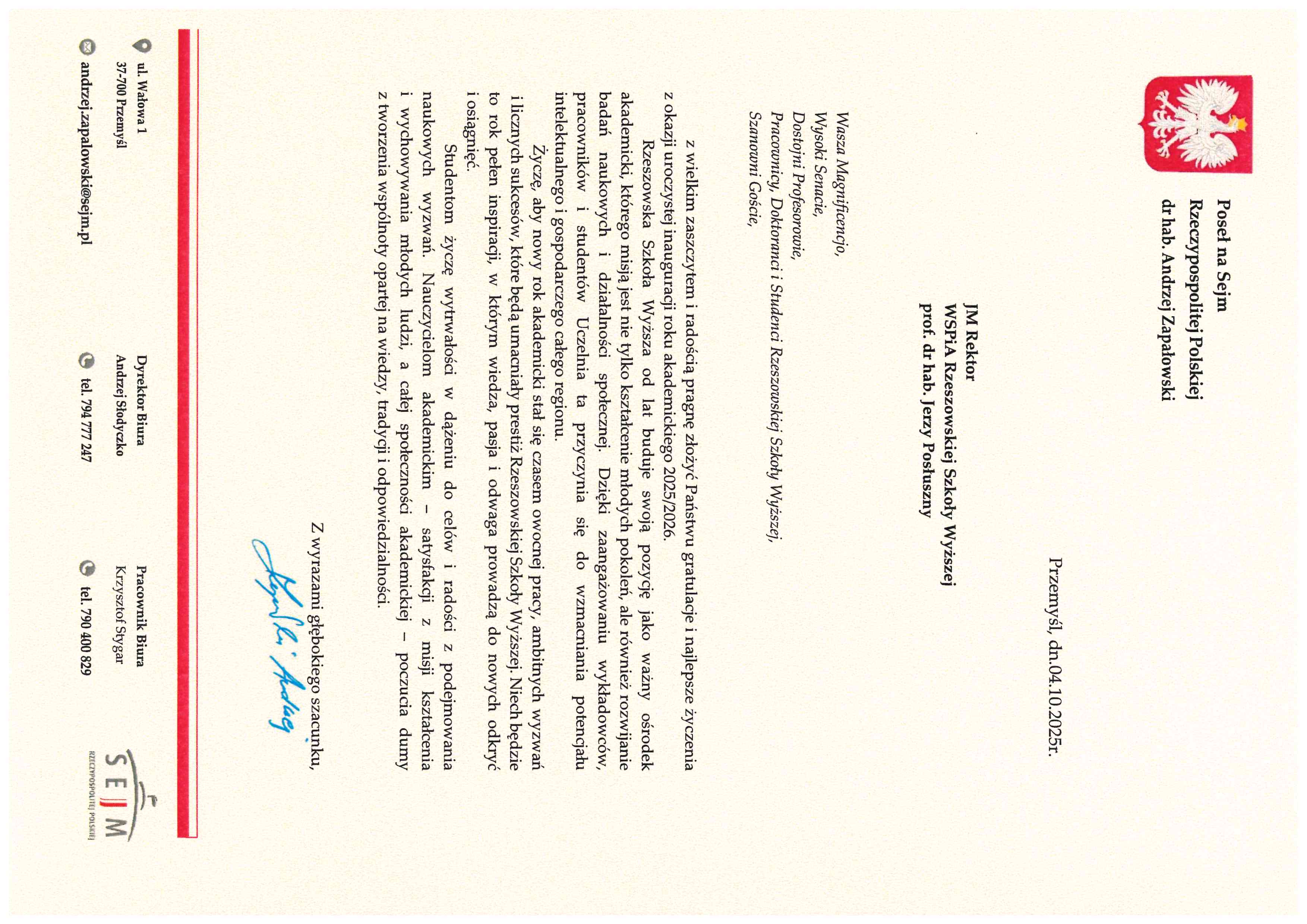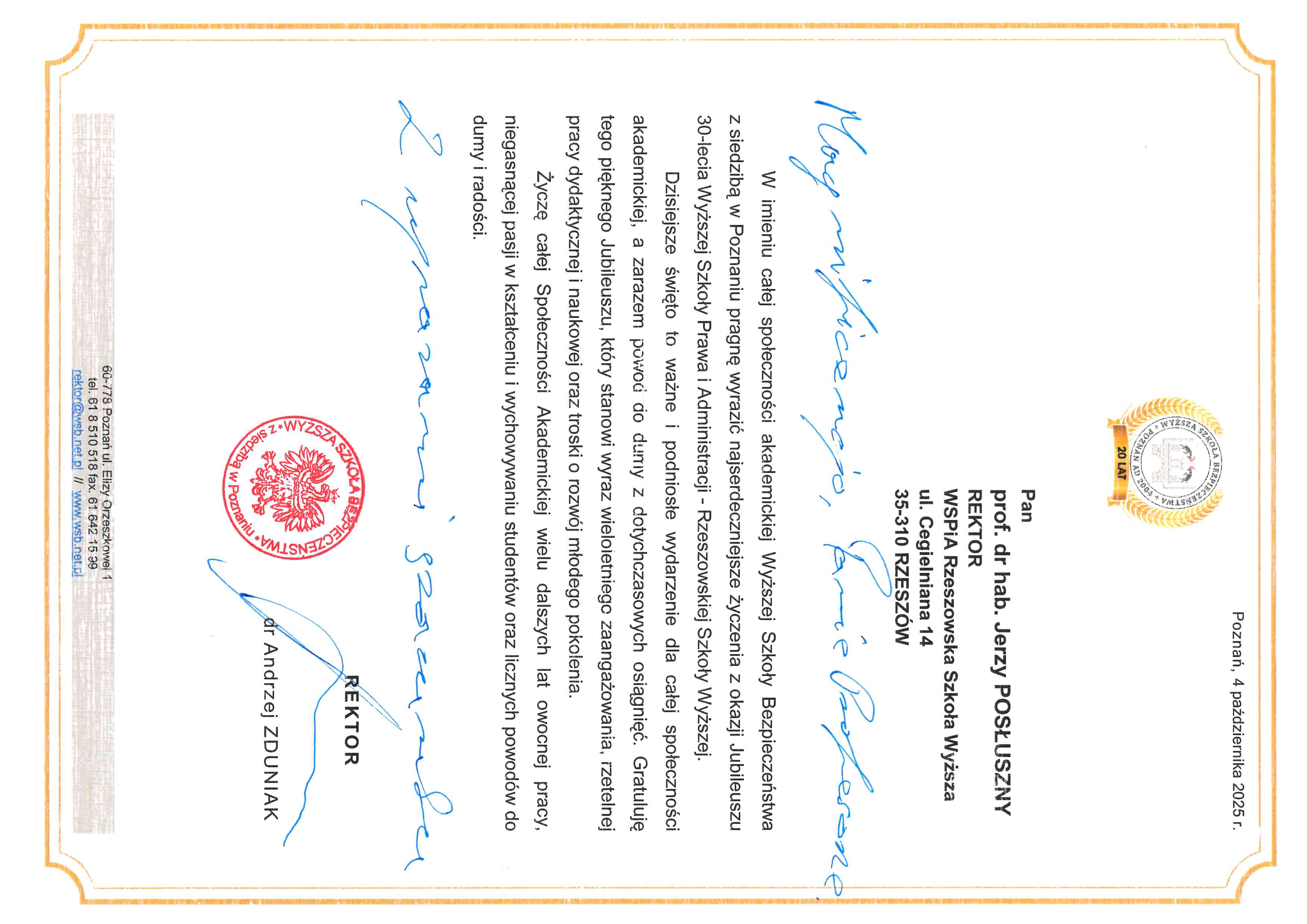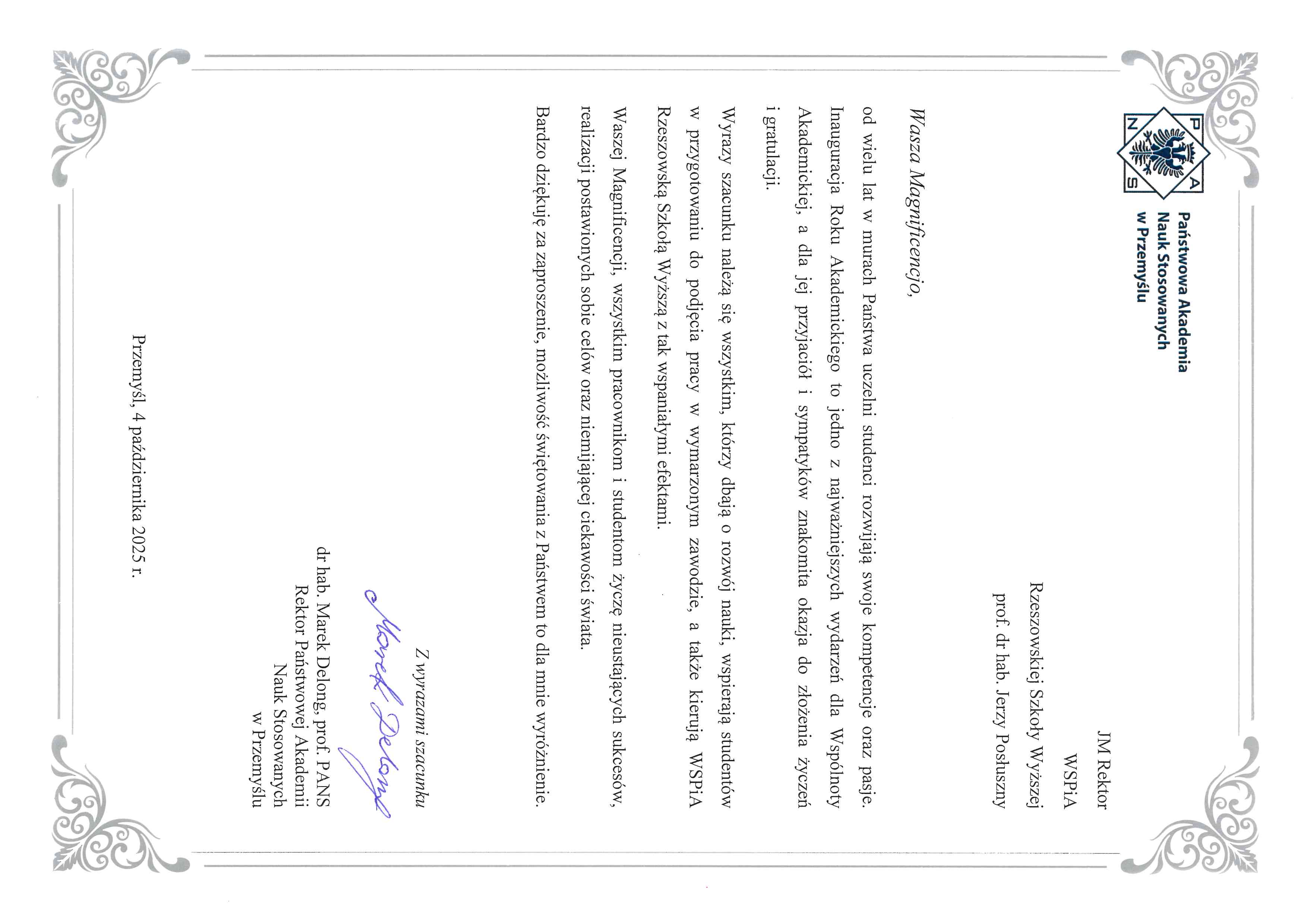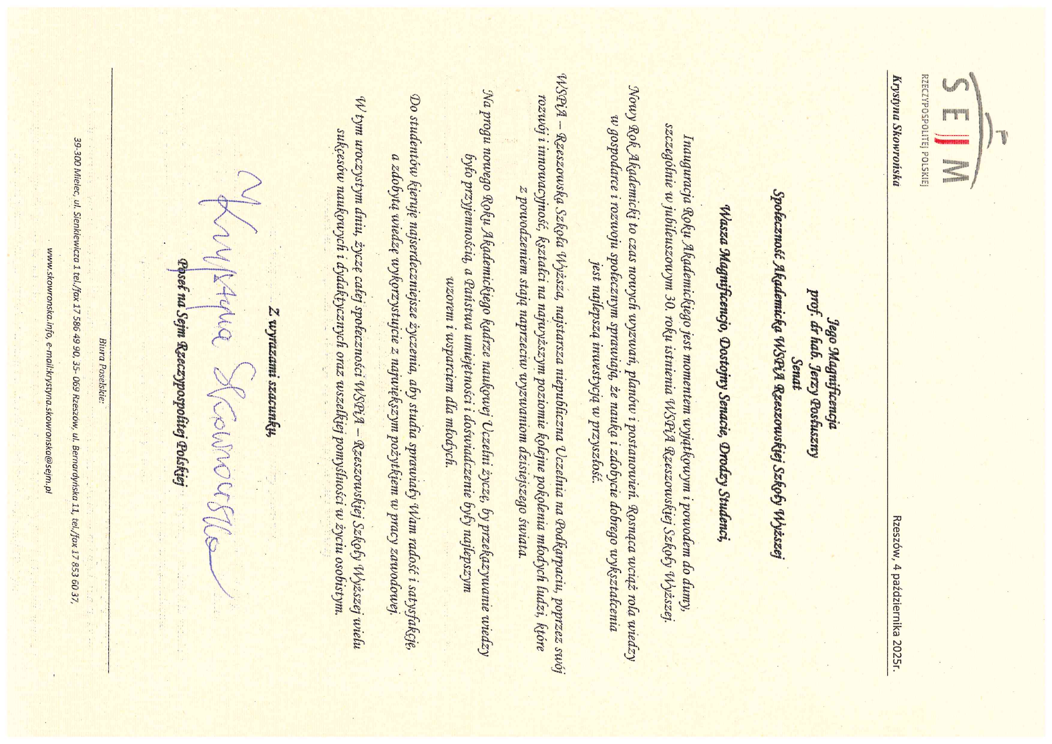 4 października 2025 r. WSPiA Rzeszowska Szkoła Wyższa uroczyście zainaugurowała Jubileuszowy Rok Akademicki 2025/2026. Z tej okazji na ręce Rektora prof. Jerzego Posłusznego wpłynęły liczne listy gratulacyjne oraz życzenia, skierowane przez przedstawicieli parlamentu, administracji państwowej, służb mundurowych oraz środowisk akademickich.
