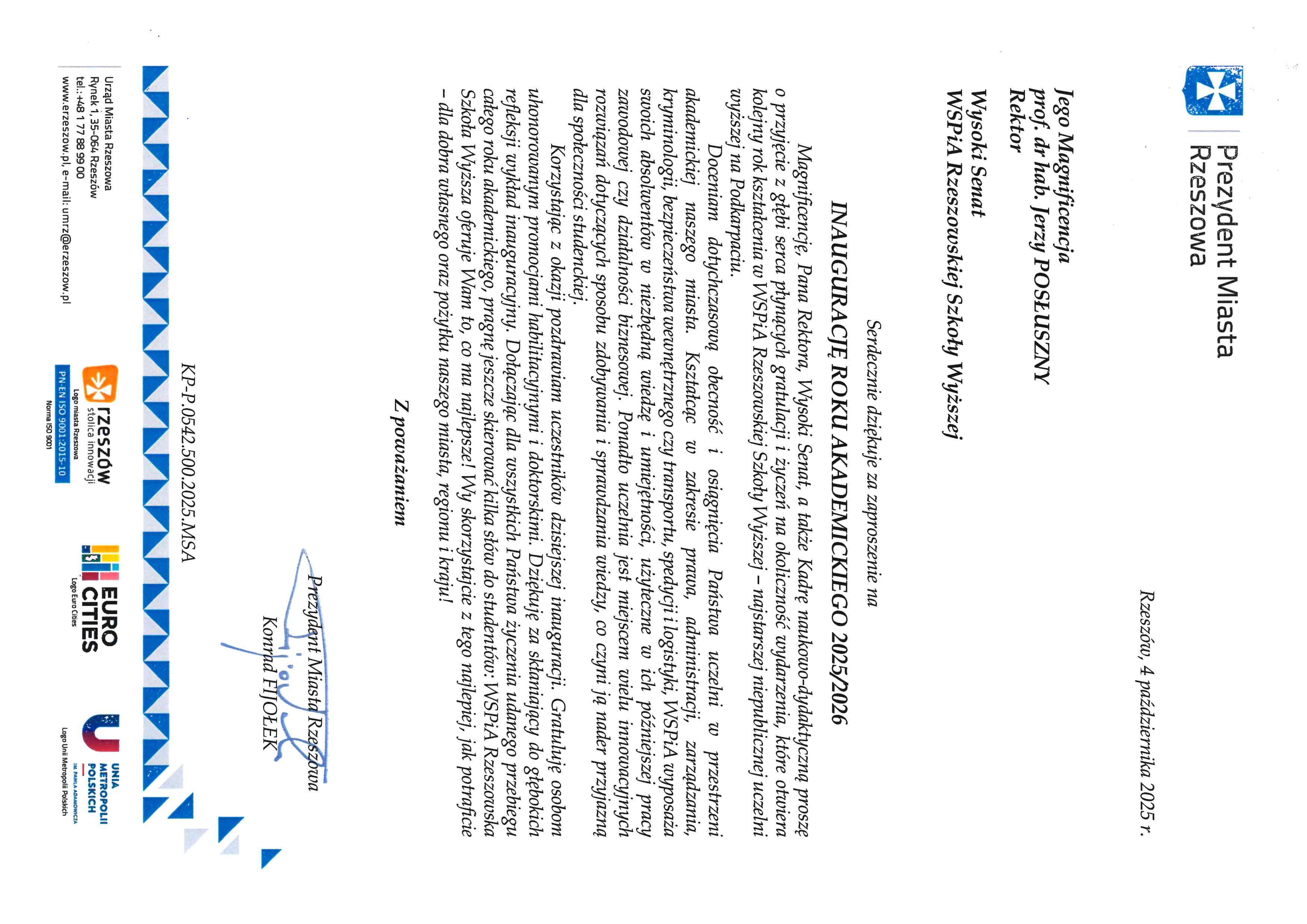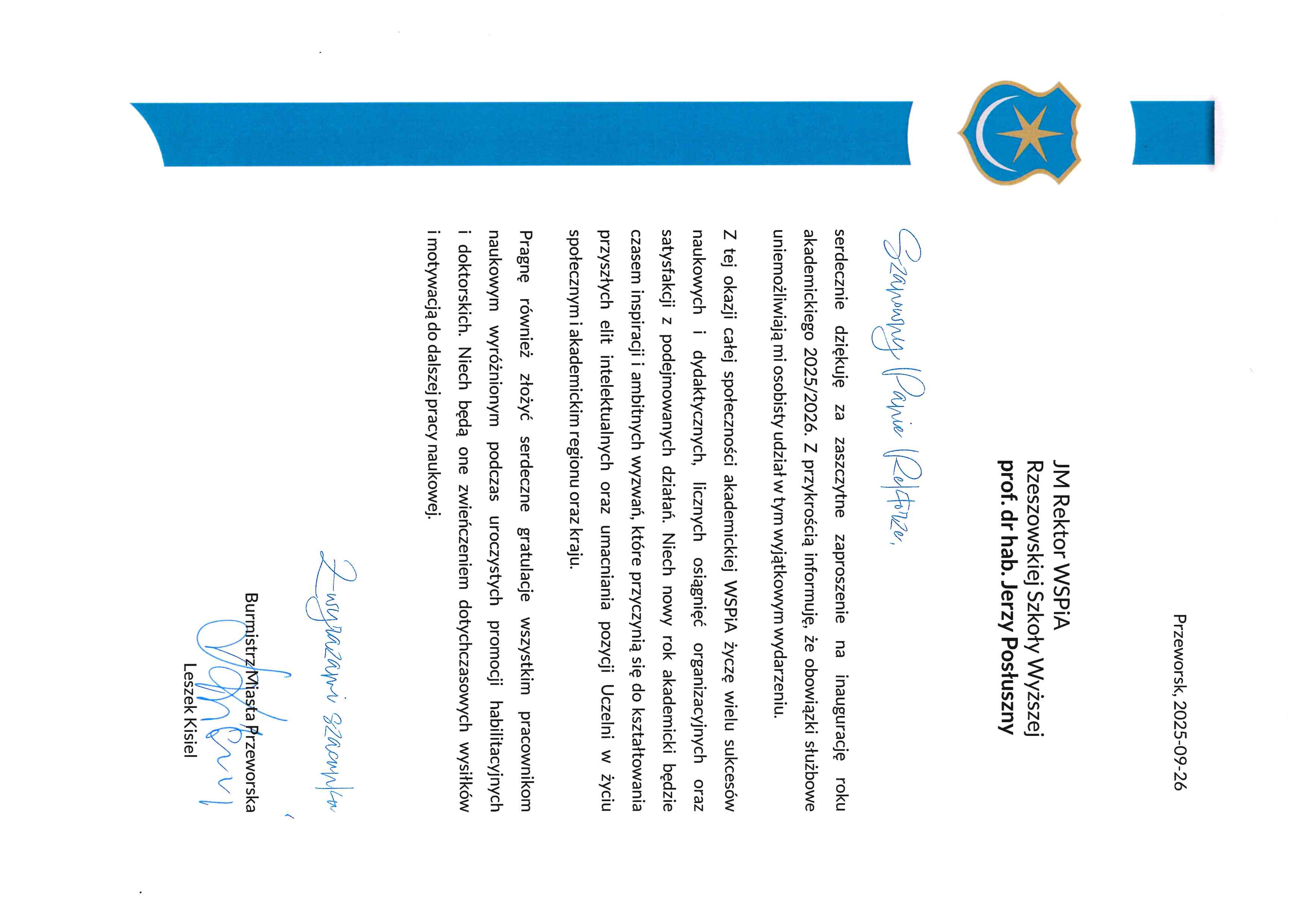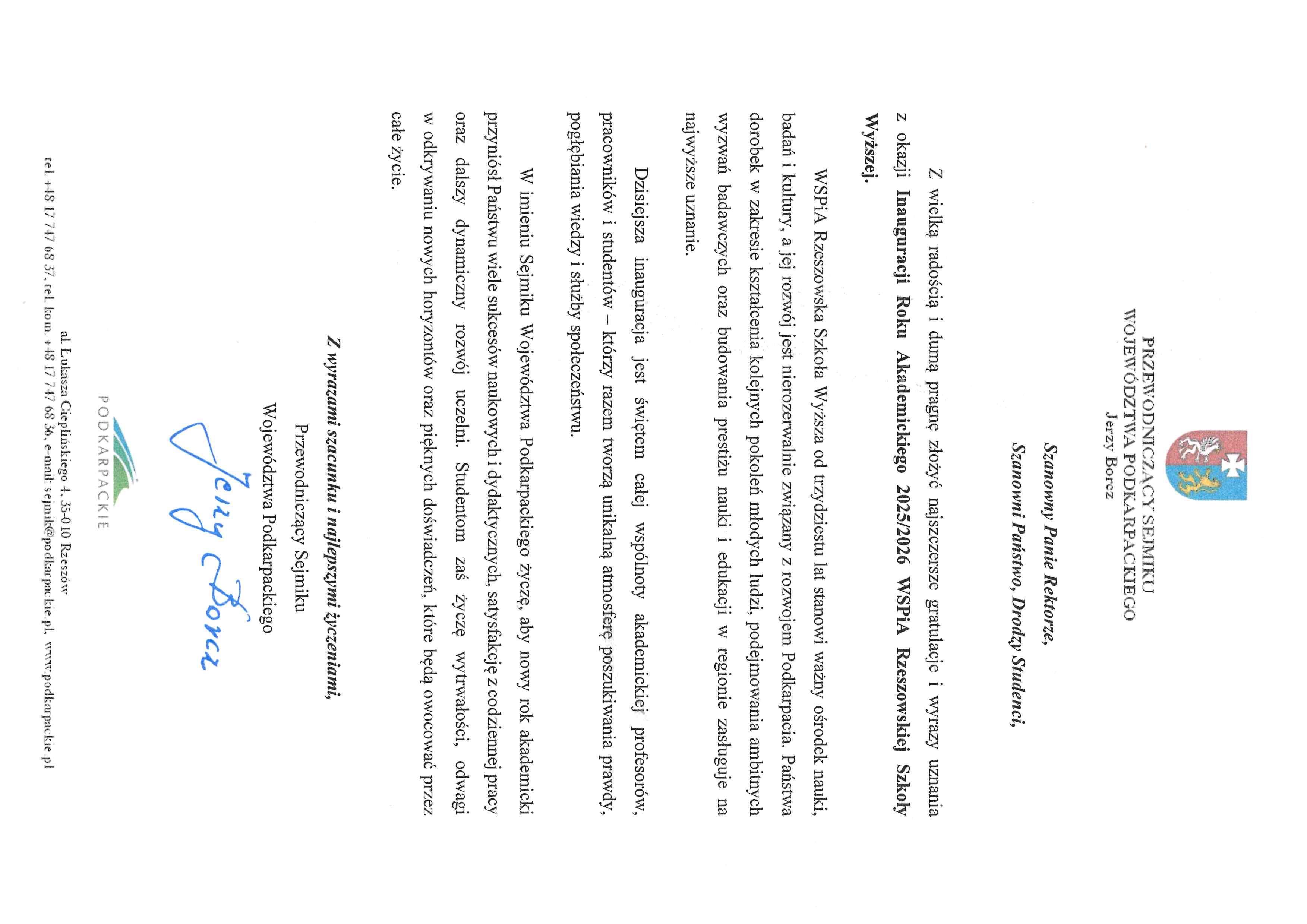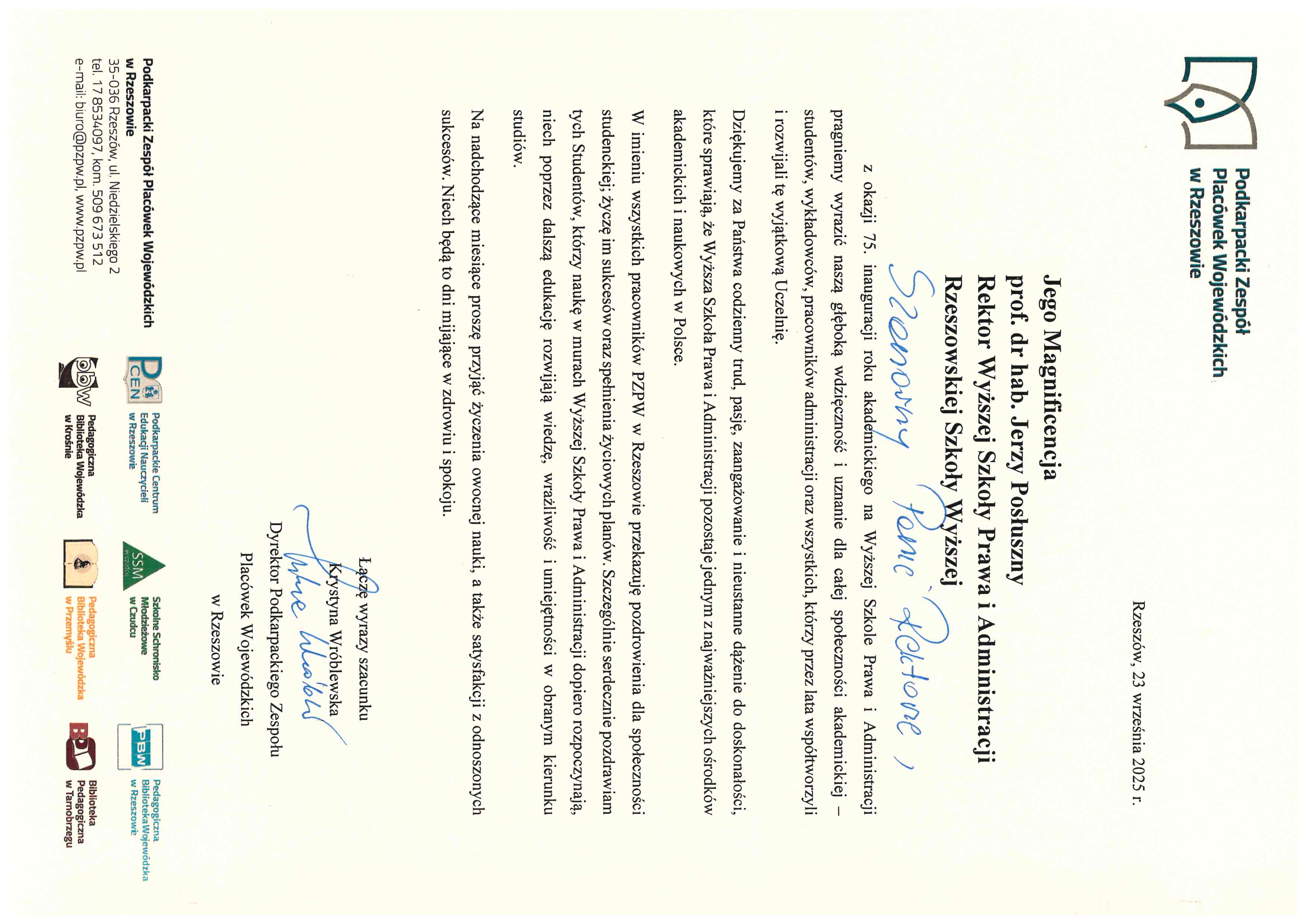 4 października 2025 r. WSPiA Rzeszowska Szkoła Wyższa uroczyście zainaugurowała Jubileuszowy Rok Akademicki 2025/2026. Z tej okazji na ręce Rektora prof. Jerzego Posłusznego wpłynęły liczne listy gratulacyjne oraz życzenia, skierowane przez przedstawicieli parlamentu, administracji państwowej, służb mundurowych oraz środowisk akademickich.