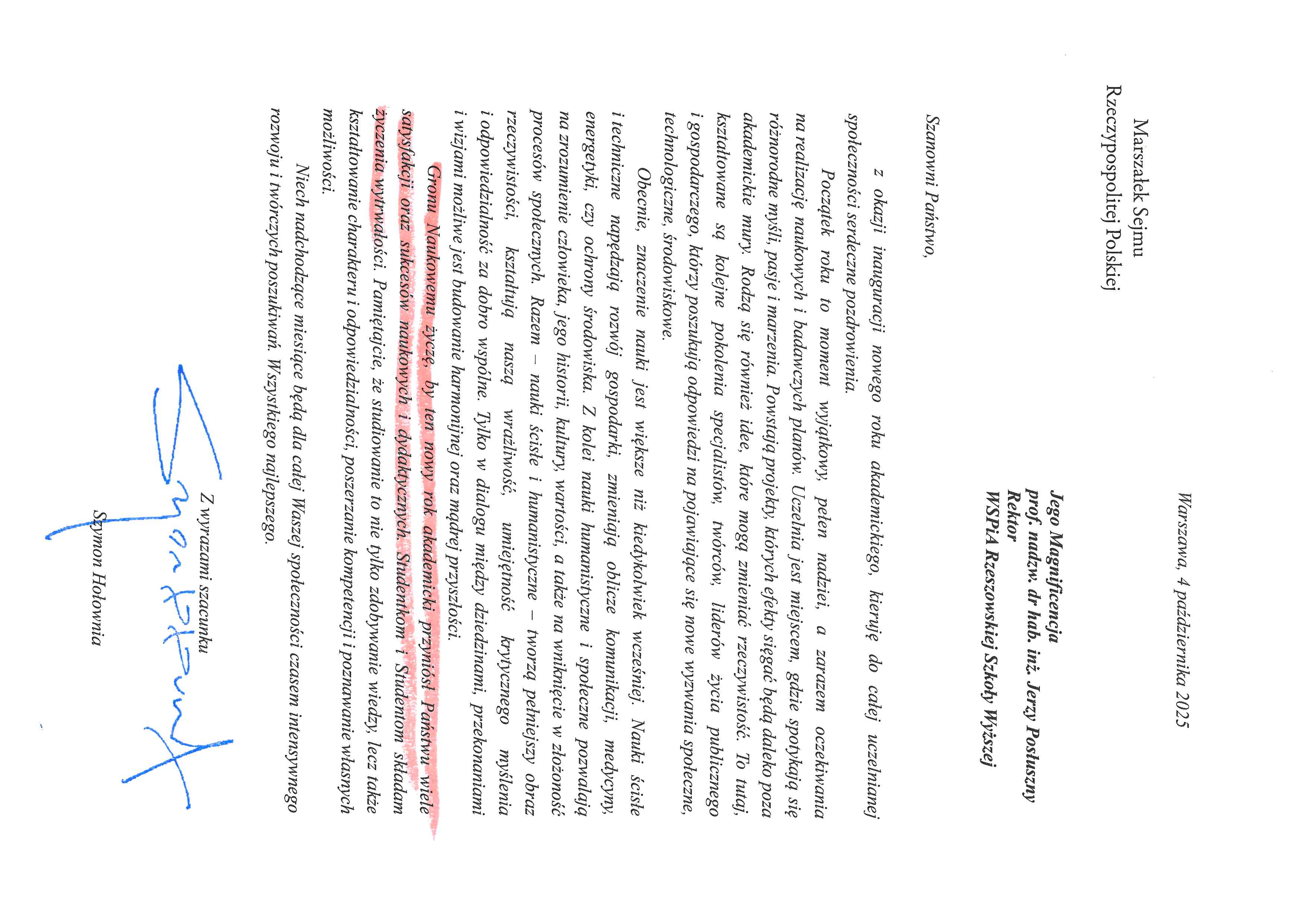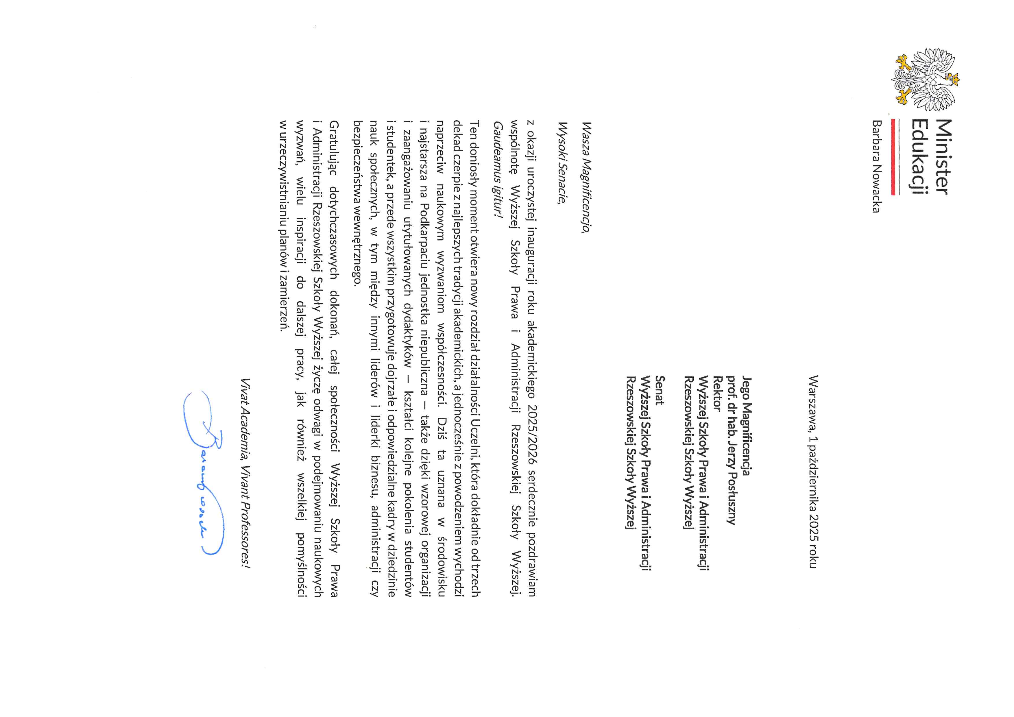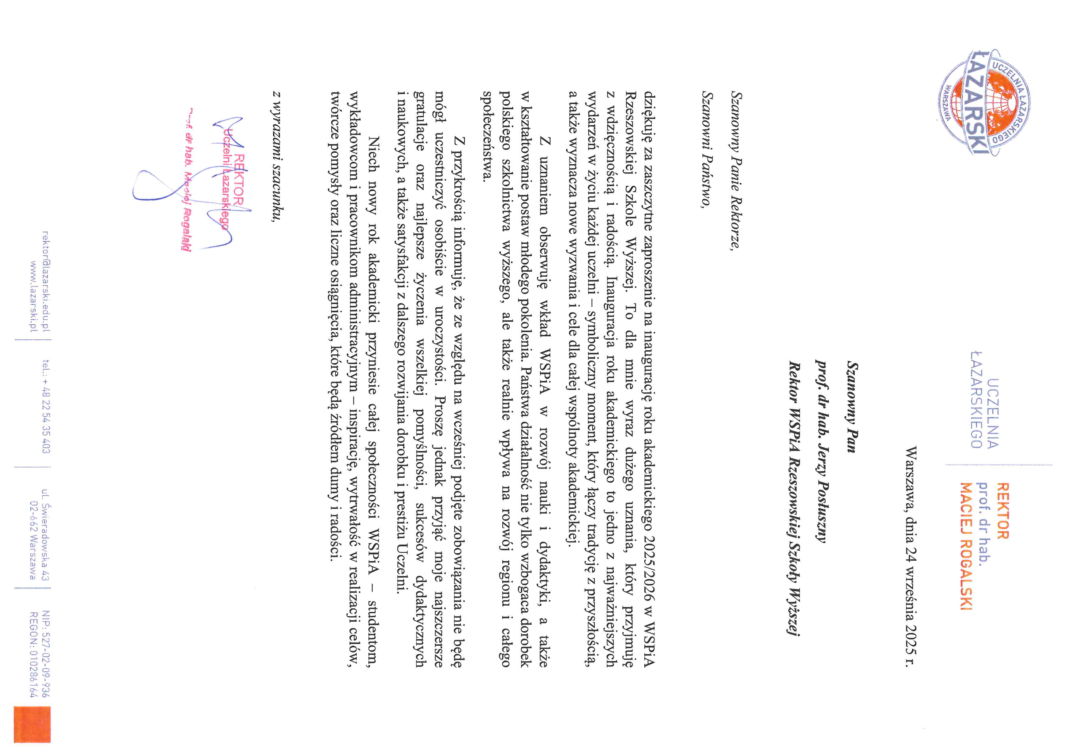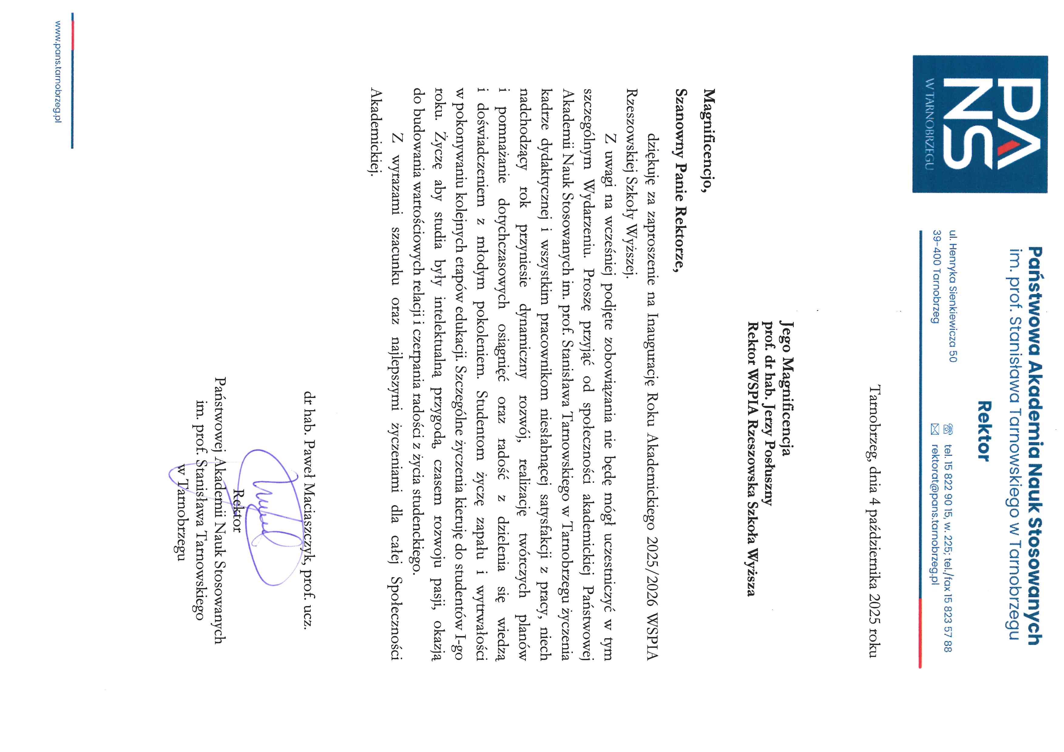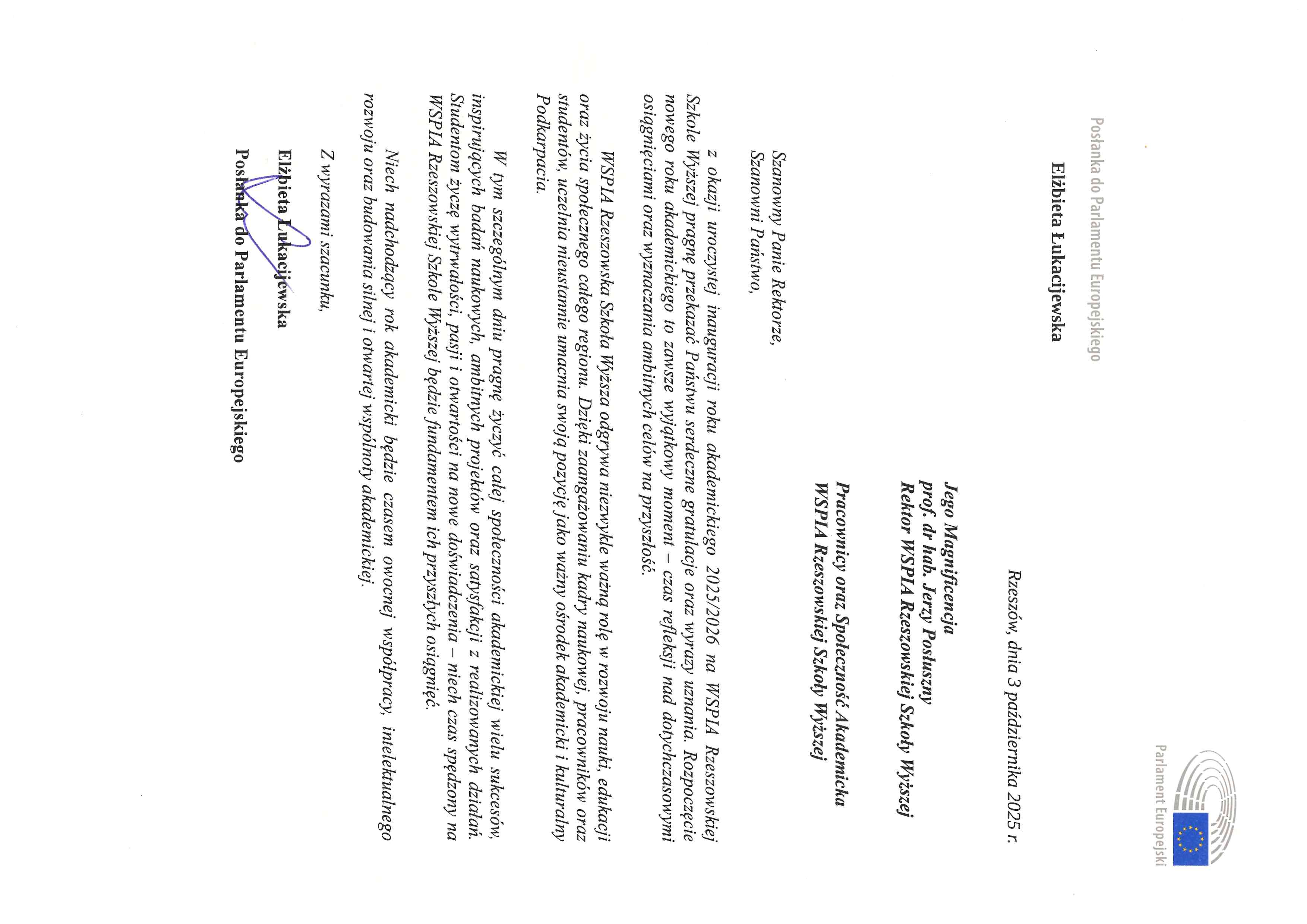 4 października 2025 r. WSPiA Rzeszowska Szkoła Wyższa uroczyście zainaugurowała Jubileuszowy Rok Akademicki 2025/2026. Z tej okazji na ręce Rektora prof. Jerzego Posłusznego wpłynęły liczne listy gratulacyjne oraz życzenia, skierowane przez przedstawicieli parlamentu, administracji państwowej, służb mundurowych oraz środowisk akademickich.