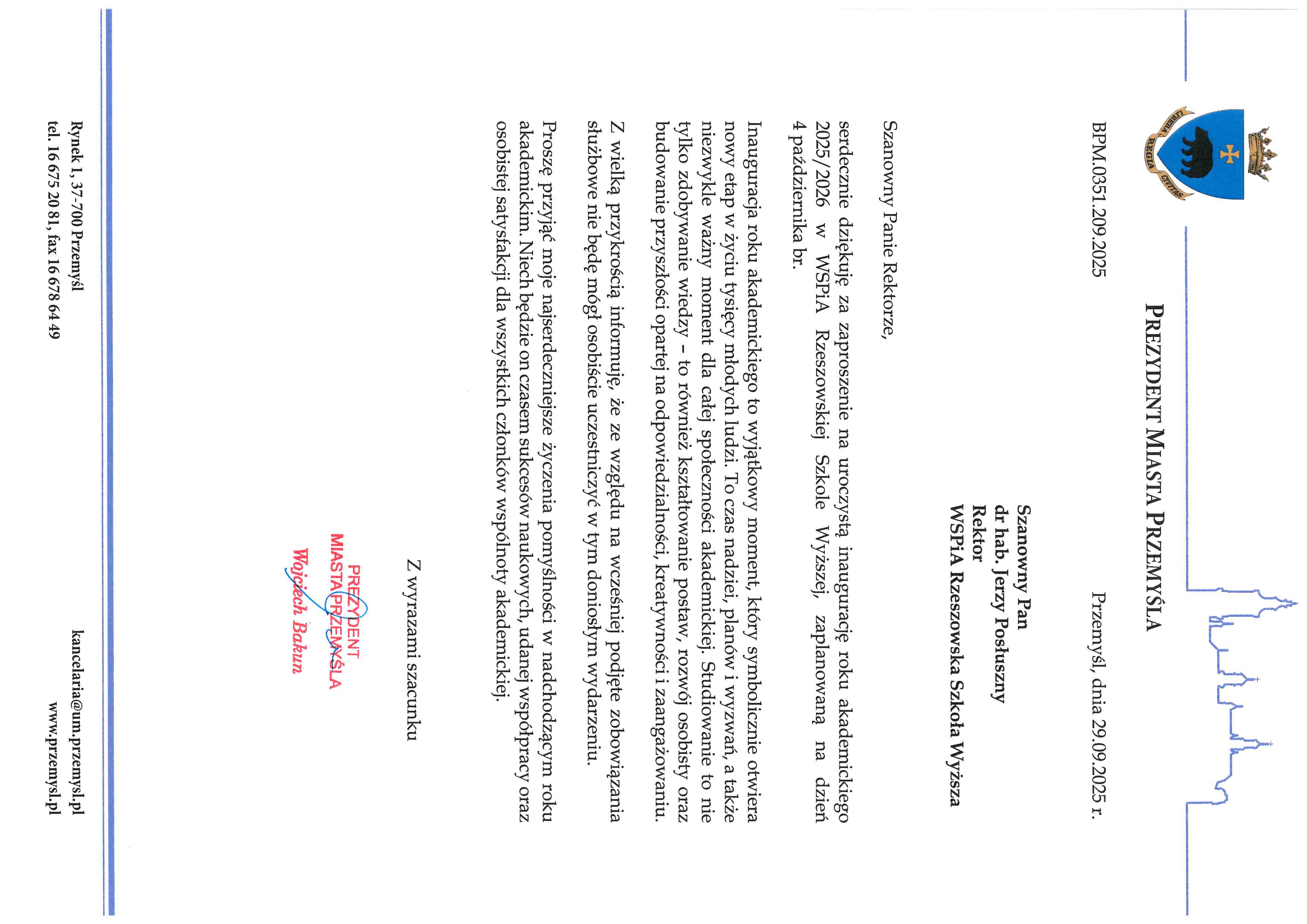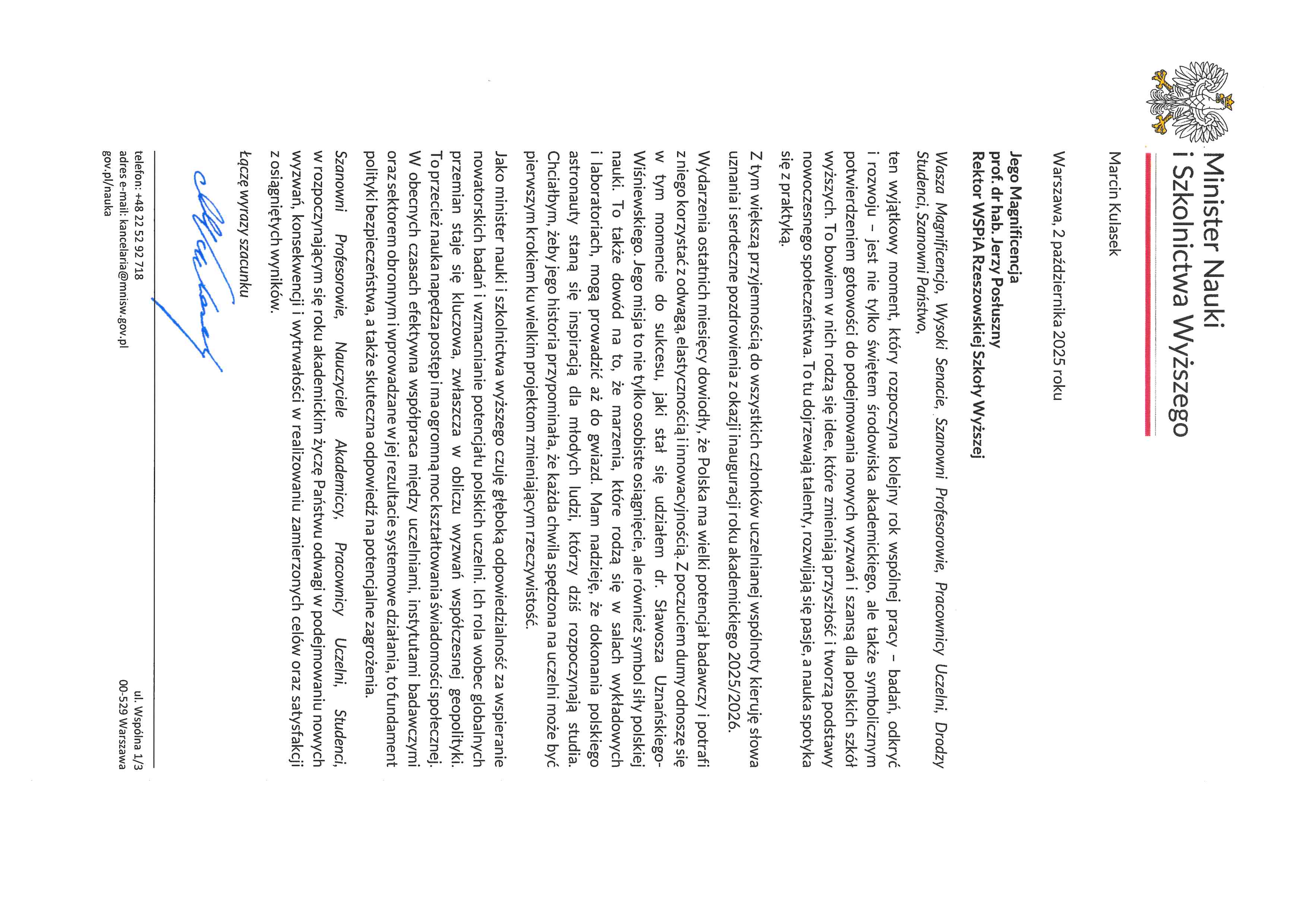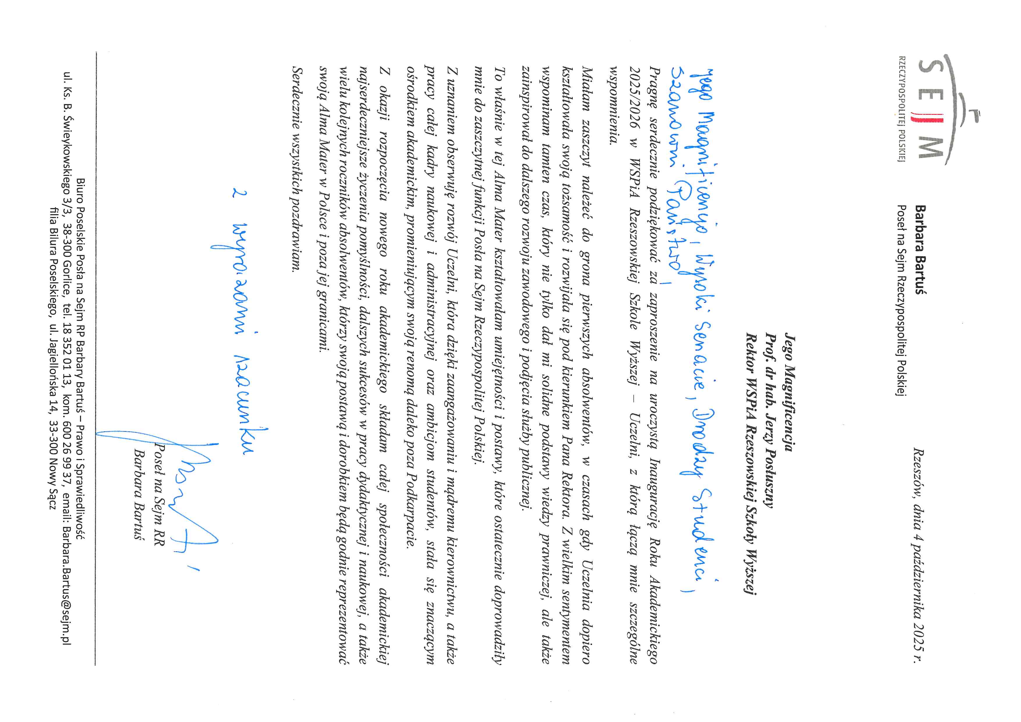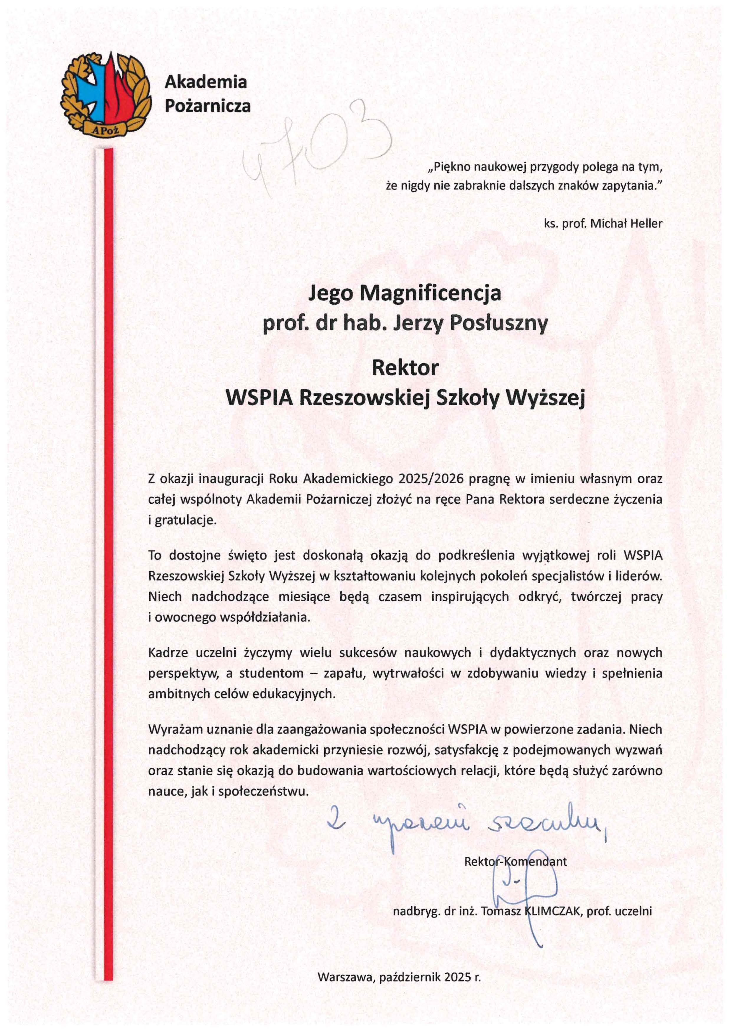 4 października 2025 r. WSPiA Rzeszowska Szkoła Wyższa uroczyście zainaugurowała Jubileuszowy Rok Akademicki 2025/2026. Z tej okazji na ręce Rektora prof. Jerzego Posłusznego wpłynęły liczne listy gratulacyjne oraz życzenia, skierowane przez przedstawicieli parlamentu, administracji państwowej, służb mundurowych oraz środowisk akademickich.