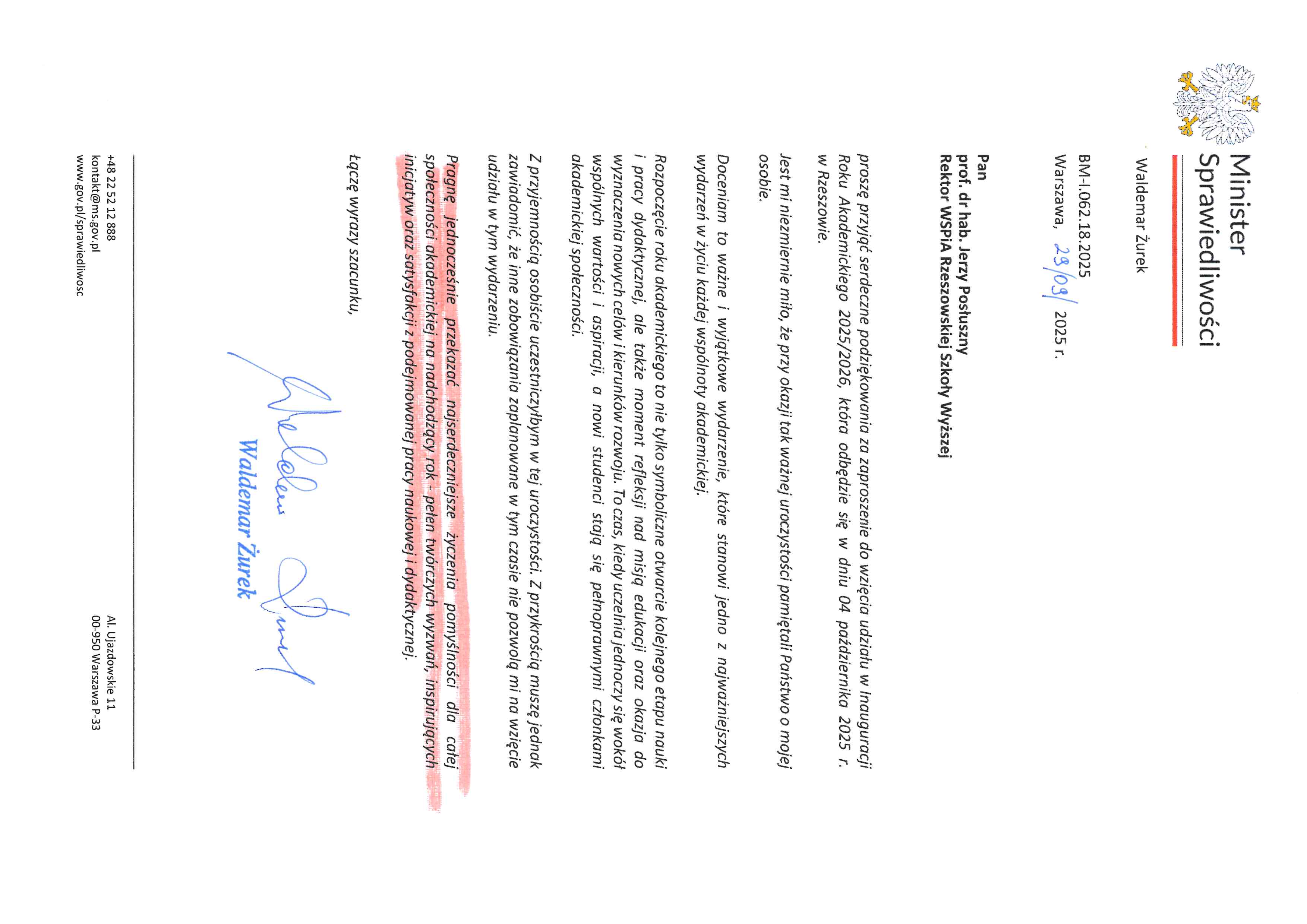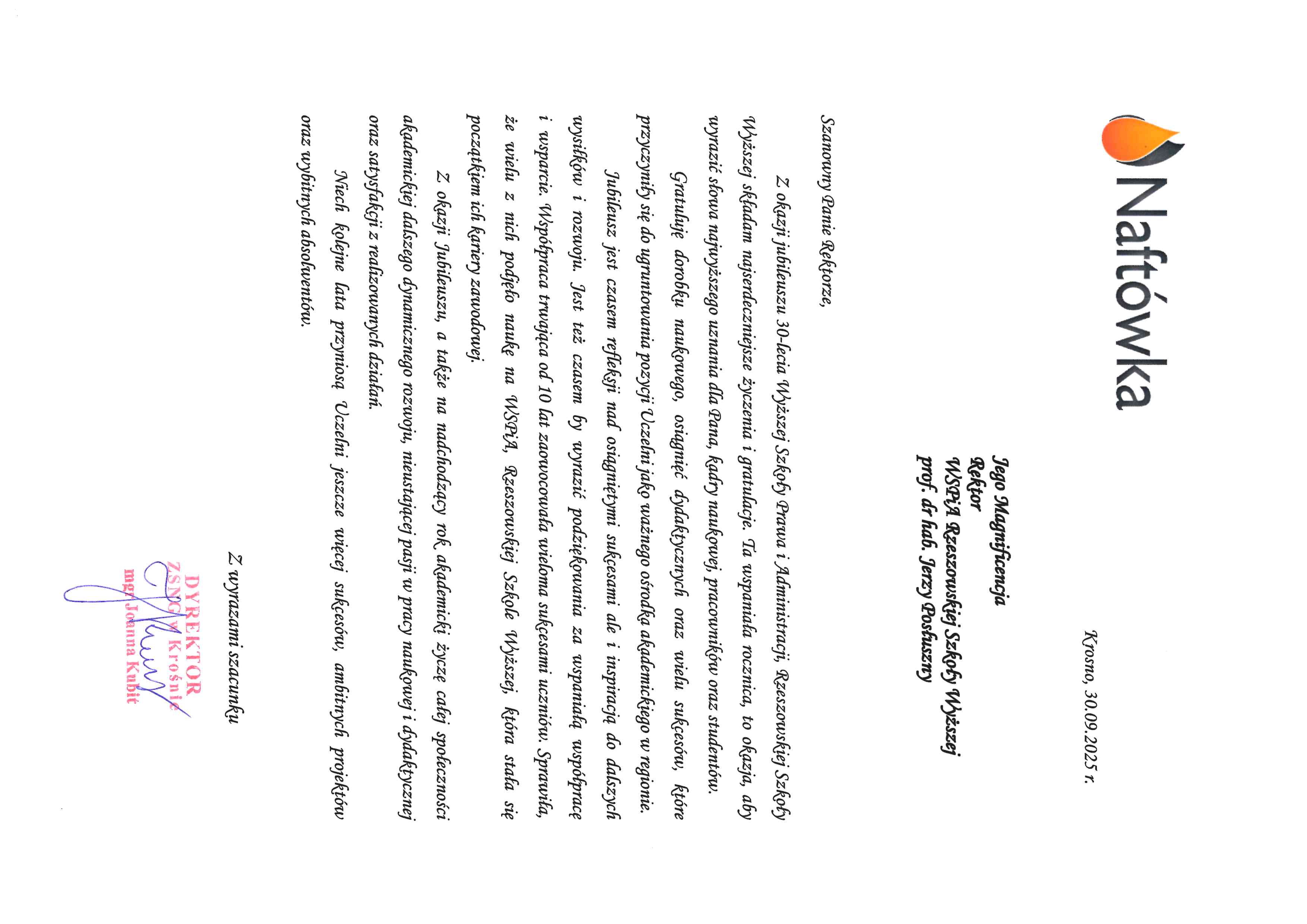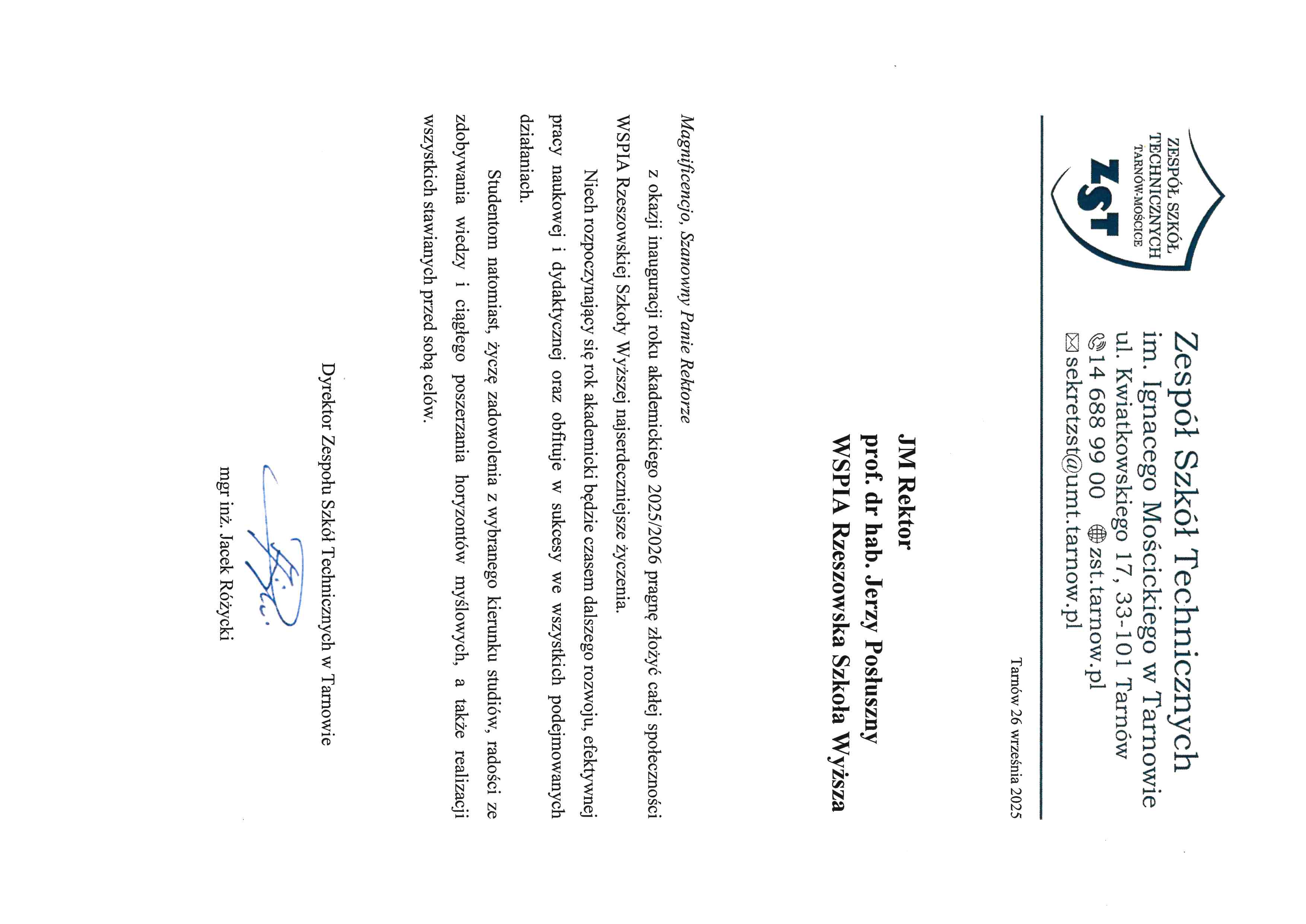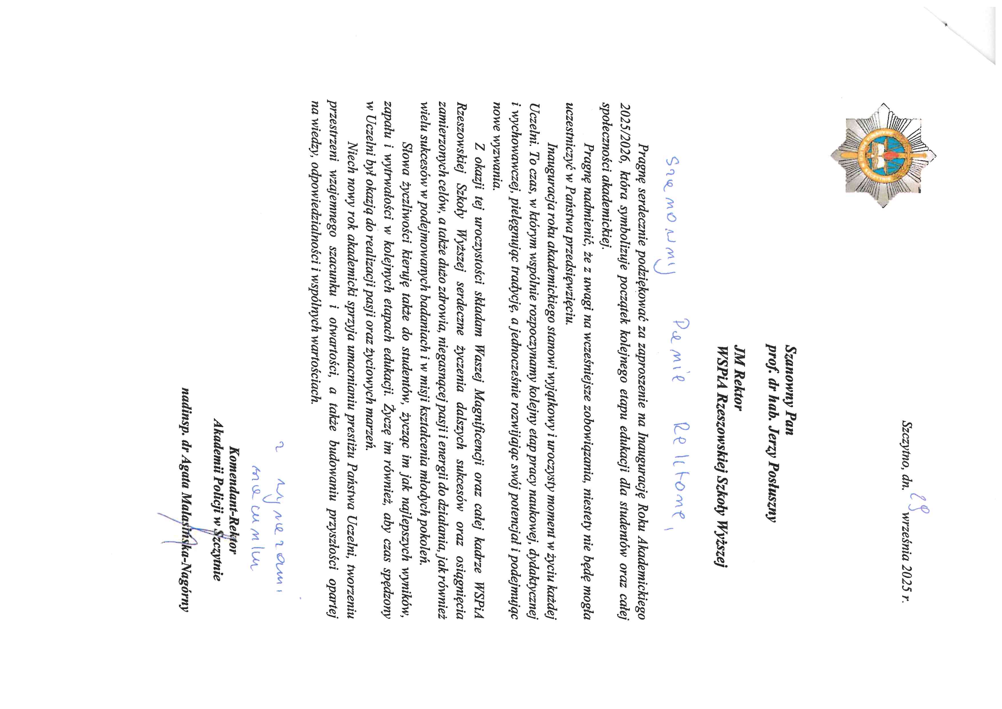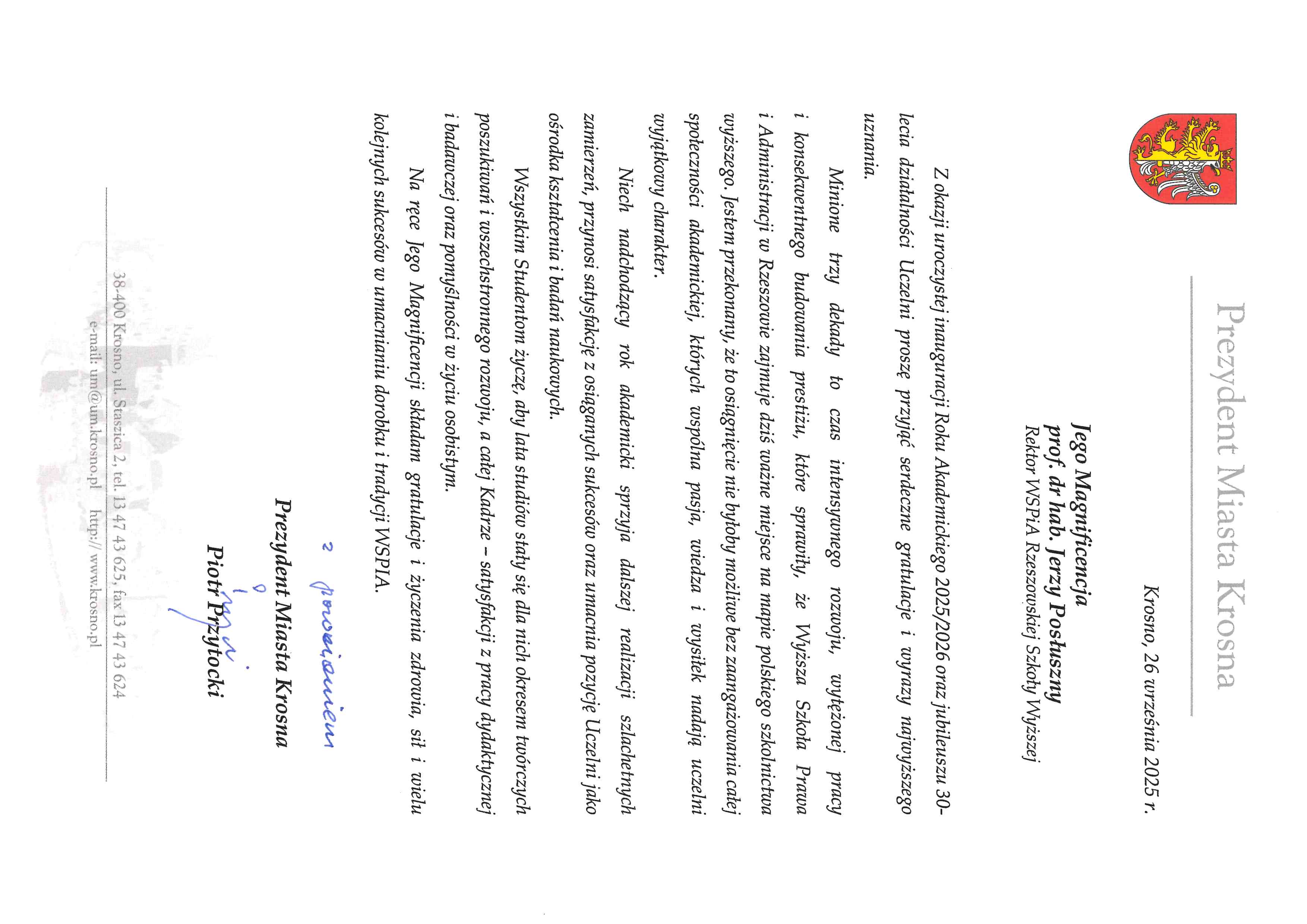 4 października 2025 r. WSPiA Rzeszowska Szkoła Wyższa uroczyście zainaugurowała Jubileuszowy Rok Akademicki 2025/2026. Z tej okazji na ręce Rektora prof. Jerzego Posłusznego wpłynęły liczne listy gratulacyjne oraz życzenia, skierowane przez przedstawicieli parlamentu, administracji państwowej, służb mundurowych oraz środowisk akademickich.