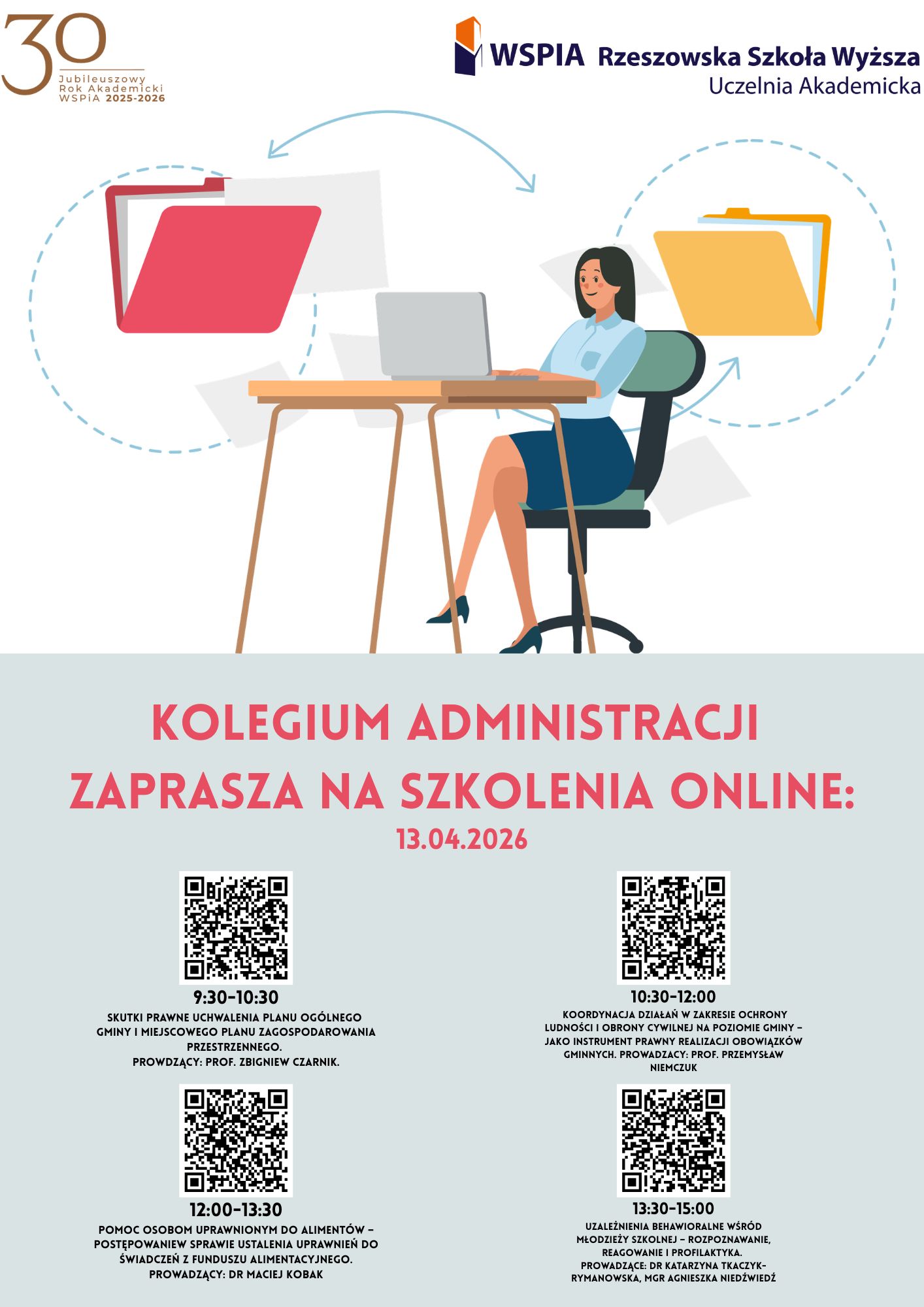- 12.00-13.30 - Pomoc osobom uprawnionym do alimentów – postępowanie w sprawie ustalenia uprawnień do świadczeń z funduszu alimentacyjnego. Prowadzący: dr Maciej Kobak. Link do spotkania.