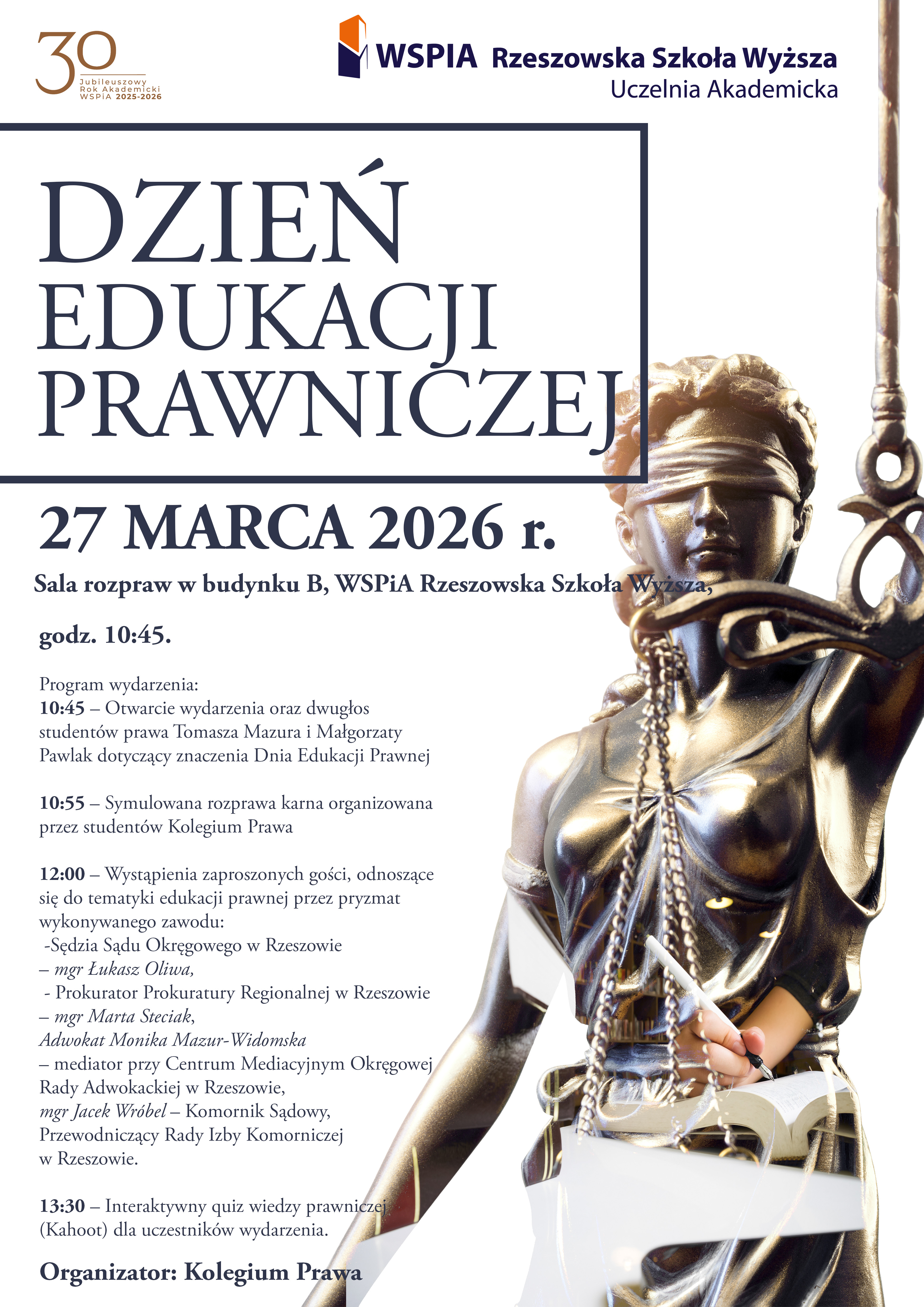 Dzień Edukacji Prawnej w WSPiA stanowi istotny element kształcenia praktycznego studentów oraz wpisuje się w realizowaną przez Uczelnię ideę łączenia teorii z praktyką. Inicjatywa sprzyja również wzmacnianiu współpracy ze środowiskiem prawniczym regionu oraz budowaniu przestrzeni do wymiany doświadczeń między studentami a przedstawicielami zawodów prawniczych.