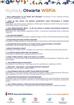 14 aktualnych tematów złoży się na cykl „Wykładów Otwartych” przygotowanych przez WSPiA Rzeszowską Szkołę Wyższą głównie dla uczniów z podkarpackich szkół średnich. Podczas spotkań z młodzieżą poruszone zostaną tematy dotyczące m.in. wojny, dezinformacji, kryminalistyki i kryminologii, praw człowieka, ekonomii czy psychologii. Wykłady w formie on-line odbywać się regularnie od 23 marca do 5 kwietnia 2022 r.